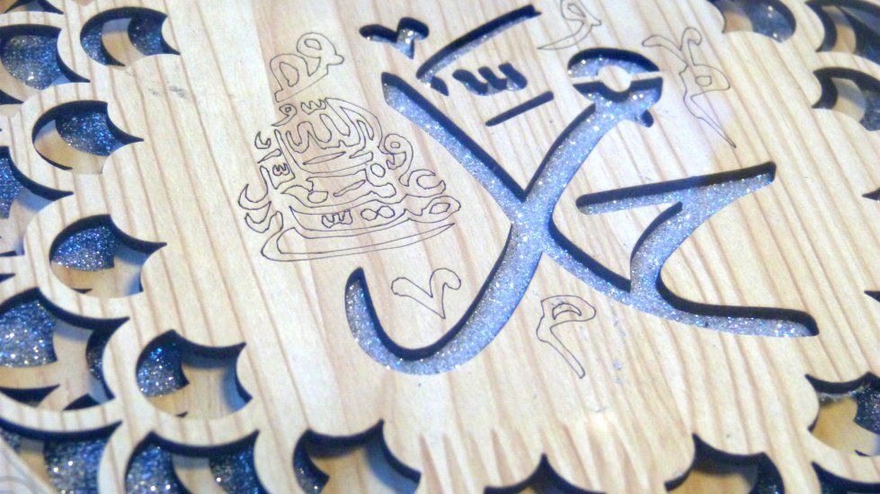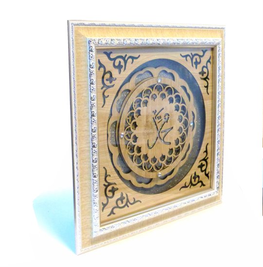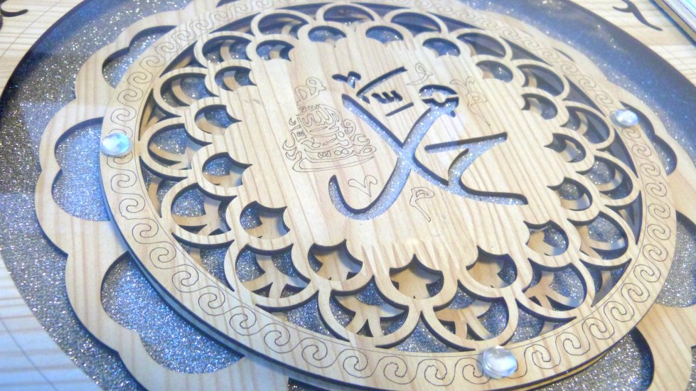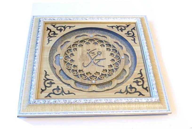 Tableau en bois avec calligraphie Mohammed (SAW) et decorations argentees
