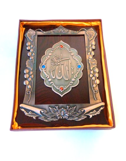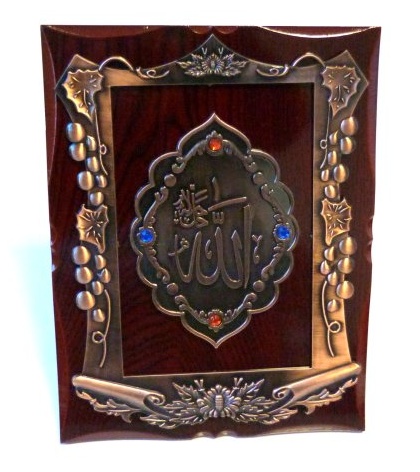 Tableau en bois avec calligraphie du Nom "Allah" (Seigneur de l'univers) avec de jolies décorations en couleur bronze.