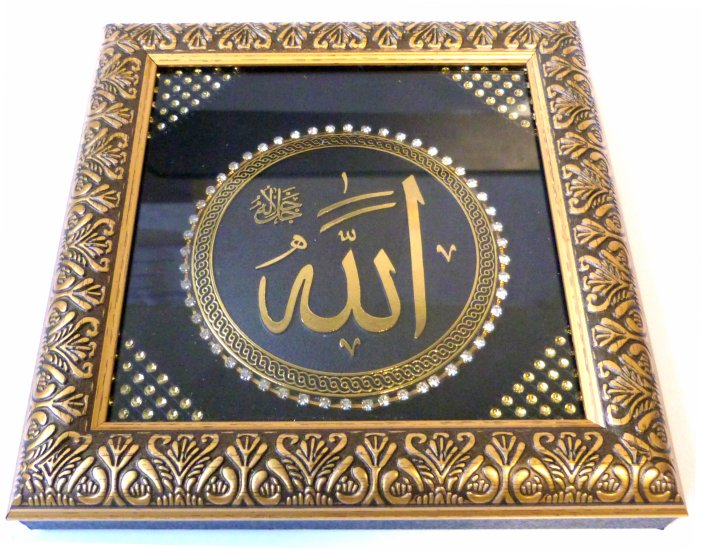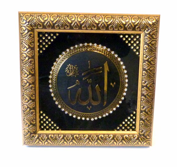 Très beau tableau (20 x 20 cm) en bois doré et décoré de strass. Le Nom Allah est calligraphié en écriture dorée au centre.
