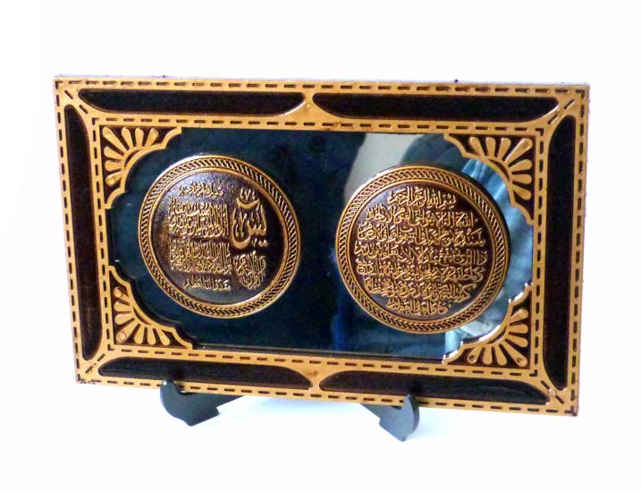 Tableau islamique dore avec fond miroir et inscriptions du Verset du Trone (Ayatoul-Koursi) et Sourate Ya-Sin