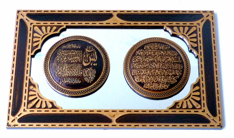 Tableau islamique doré avec en fond un miroir et deux décorations rondes fixées sur le miroir. La première contient le Verset du Trône (Ayatoul-Koursî) et la seconde les débuts de Sourate Ya-Sîn.