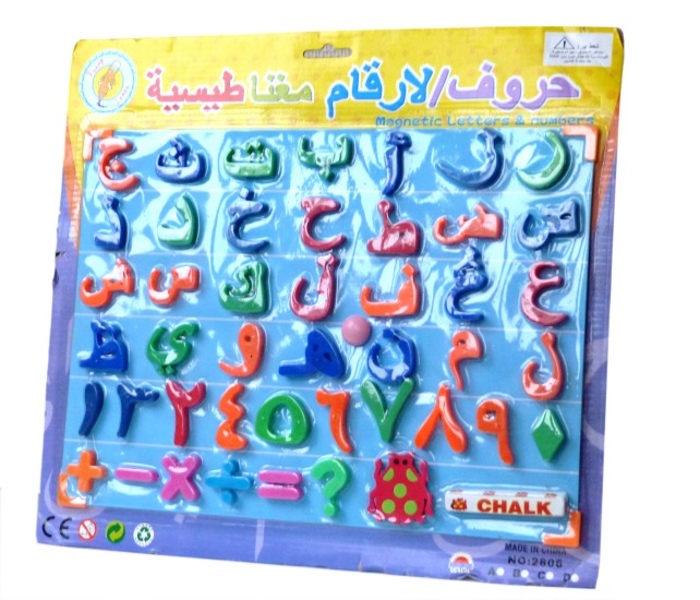 Tableau effaçable avec les 10 chiffres indiens, 5 symboles d'opérations arithmétiques et les 28 lettres de l'alphabet arabe pour l'apprentissage de la langue arabe.
