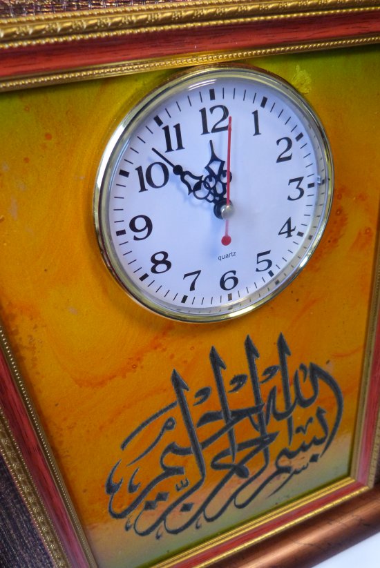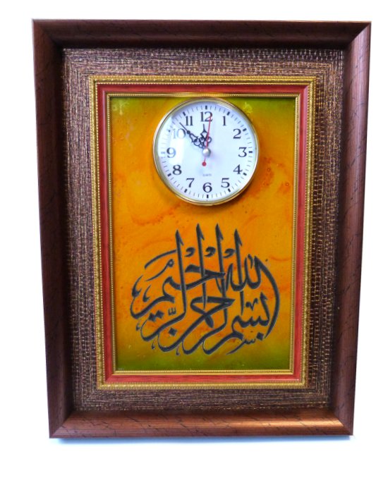 Tableau mural en bois avec pendule integree et calligraphie islamique
