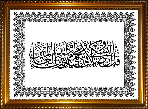 Vous recevrez un tableau avec encadrement bois décoré et doré contenant la calligraphie du verset ainsi qu'un texte optionnel de votre choix (personnalisable) en français ou en arabe. Ce texte sera placé en dessous de la calligraphie.