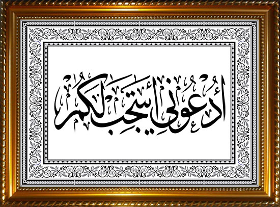 Vous recevrez un tableau avec encadrement bois décoré et doré contenant la calligraphie de Sourat Ghaafir, verset 60 ainsi qu'un texte optionnel de votre choix (personnalisable) en français ou en arabe. Ce texte sera placé en dessous de la calligraphie.