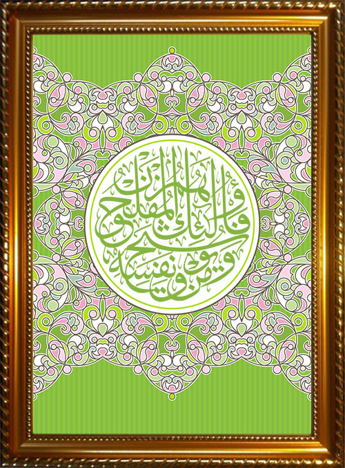 Vous recevrez un tableau avec encadrement bois décoré et doré contenant la calligraphie de Sourat 64 At-Taghâbun verset 16 ainsi qu'un texte optionnel de votre choix (personnalisable) en français ou en arabe. Ce texte sera placé en dessous de la calligraphie en bas dans la partie verte.