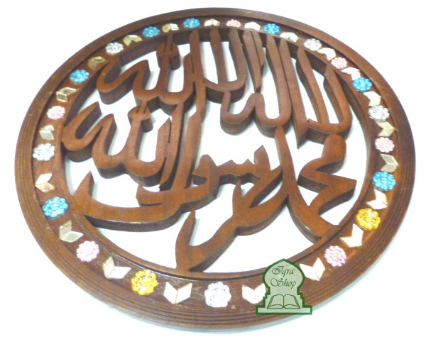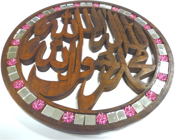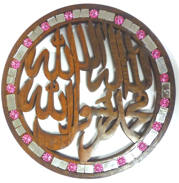 Tableau rond en bois sculpte avec l'attestation de foi musulmane