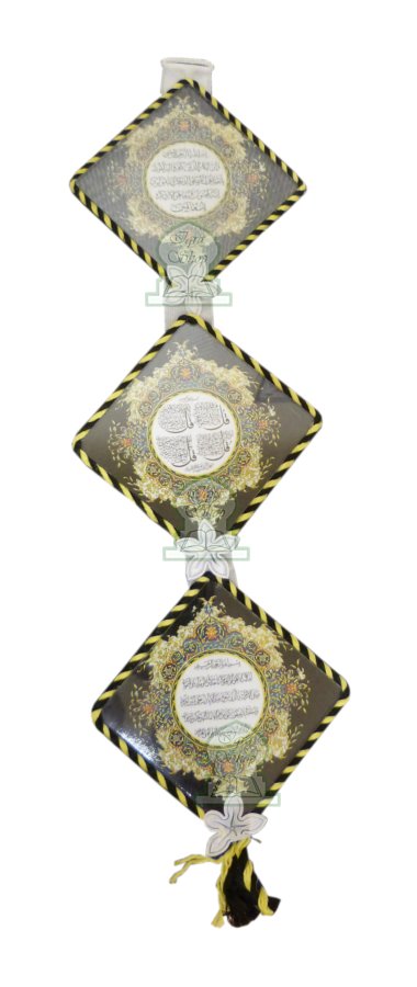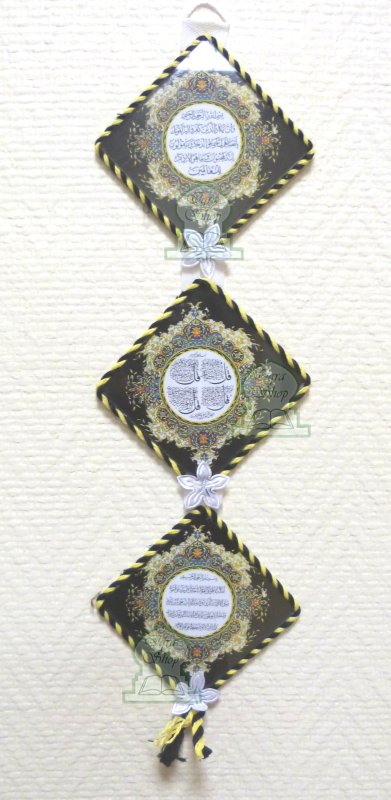 Élément décoratif artisanal, constitué de trois cadres en forme de losange en verre suspendus et garnis de tissus en fleurs et de Sabra noir et jaune ; chaque tableau porte des versets coraniques (verset du Trône...) et des sourates (les quatre sourates Qul) calligraphiés.