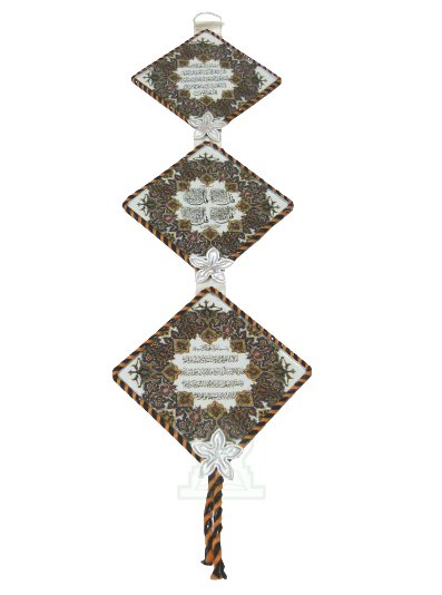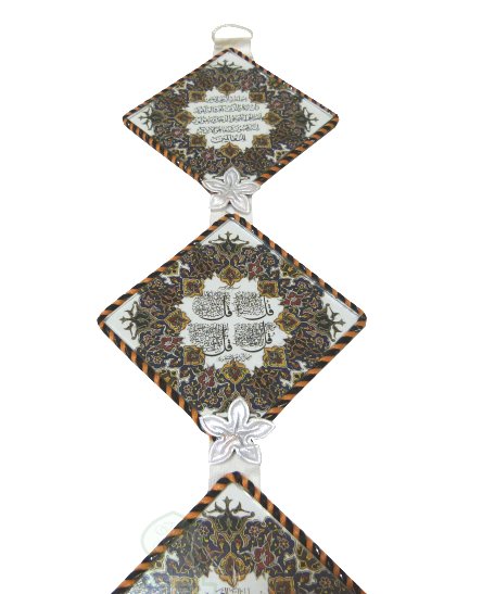 Élément décoratif artisanal, constitué de trois cadres en forme de losange en verre suspendus et garnis de tissus en fleurs et de Sabra orange et noir ; chaque tableau porte des versets coraniques (verset du Trône...) et des sourates (les quatre sourates Qul) calligraphiés.