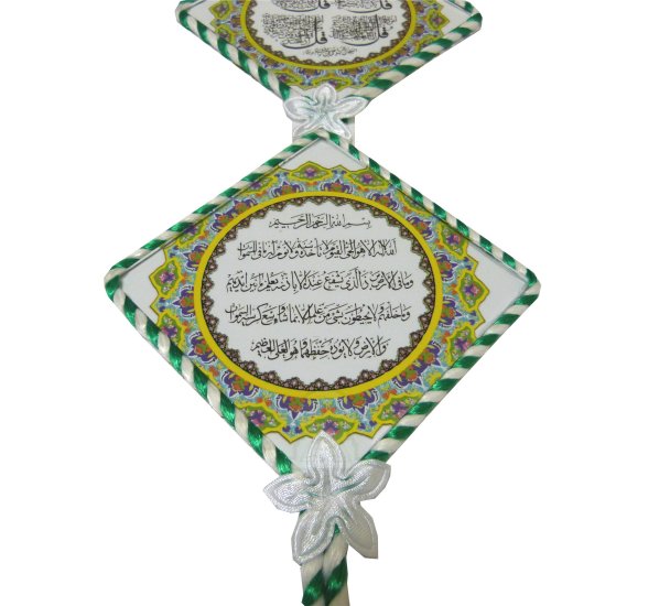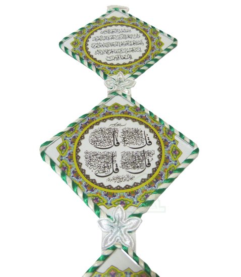 Élément décoratif artisanal, constitué de trois cadres en forme de losange en verre suspendus et garnis de tissus en fleurs et de Sabra vert et blanc ; chaque tableau porte des versets coraniques (verset du Trône...) et des sourates (les quatre sourates Qul) calligraphiés.