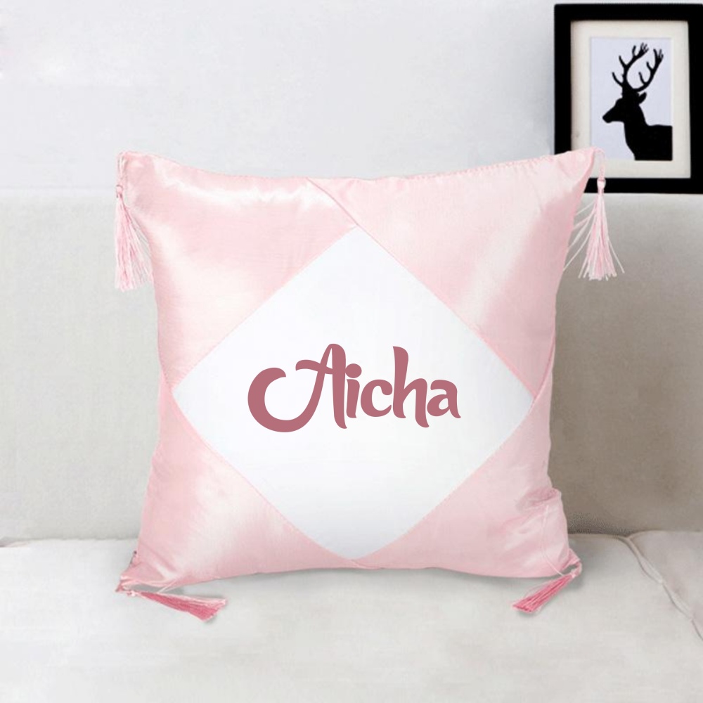 Créez votre housse de coussin avec prénom ou message personnalisé. avec pompons sur les côtés. Matière : polyester résistant. Fermeture zip cachée.