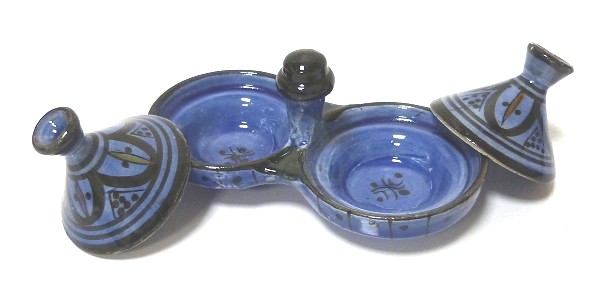Tajine triple décoratif marocain en poterie de couleur bleue émaillé décoré de motifs noirs peints - REF. 23961 (9.90 €)