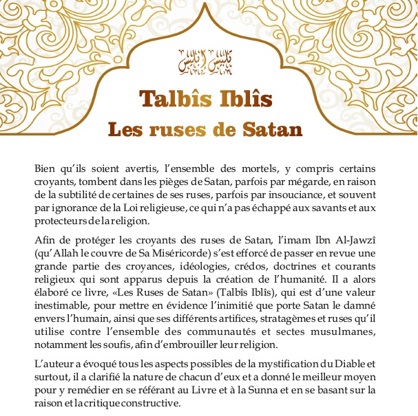 Afin de protéger les croyants des ruses de Satan, l’imam Ibn Al-Jawzî (qu’Allah le couvre de Sa Miséricorde) s’est efforcé de passer en revue une grande partie des croyances, idéologies, crédos, doctrines et courants religieux qui sont apparus depuis la création de l’humanité. Il a alors élaboré ce livre, «Les Ruses de Satan» (Talbîs Iblîs), qui est d’une valeur inestimable, pour mettre en évidence l’inimitié que porte Satan le damné envers l’humain, ainsi que ses différents artifices, stratagèmes et ruses qu’il utilise contre l’ensemble des communautés et sectes musulmanes, notamment les soufis, afin d’embrouiller leur religion.