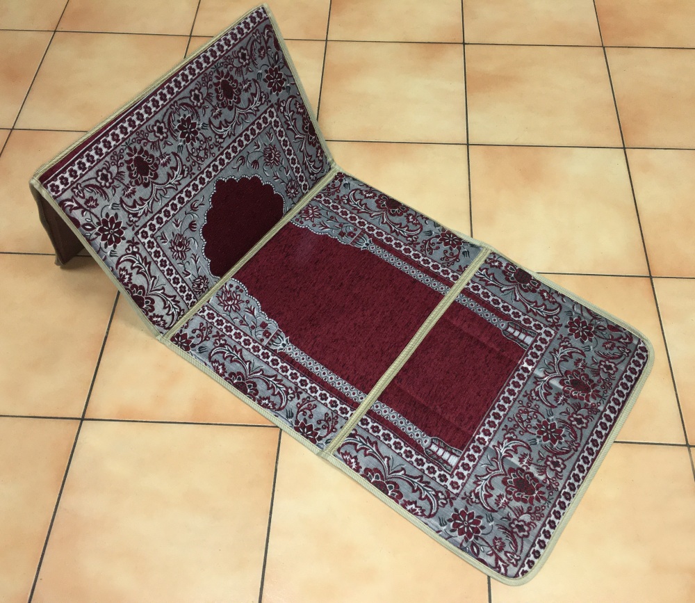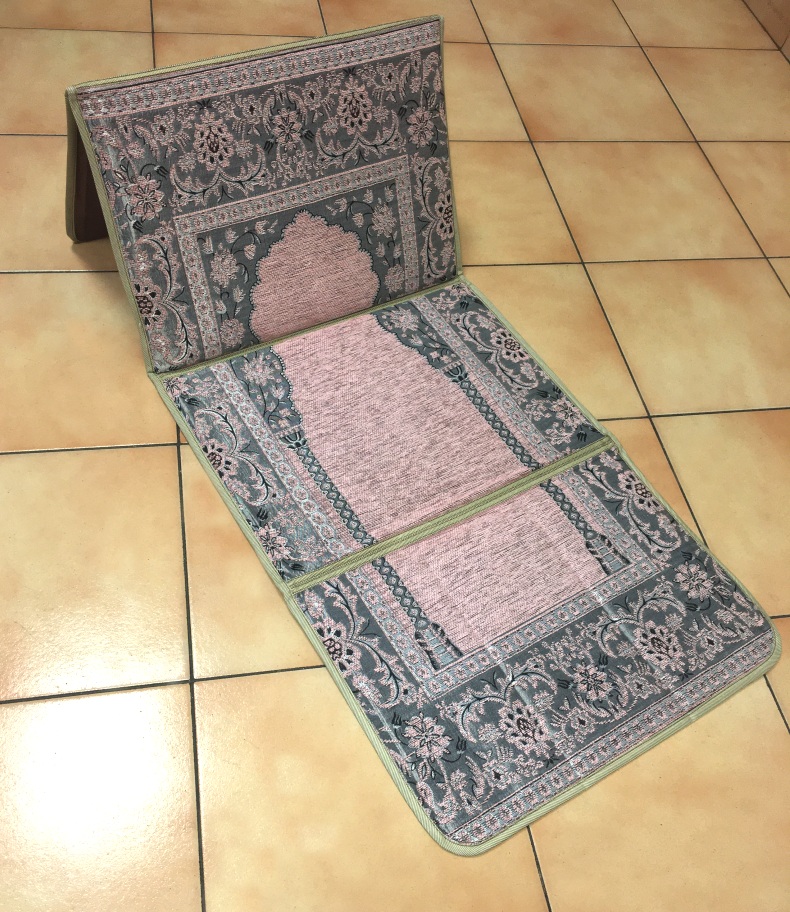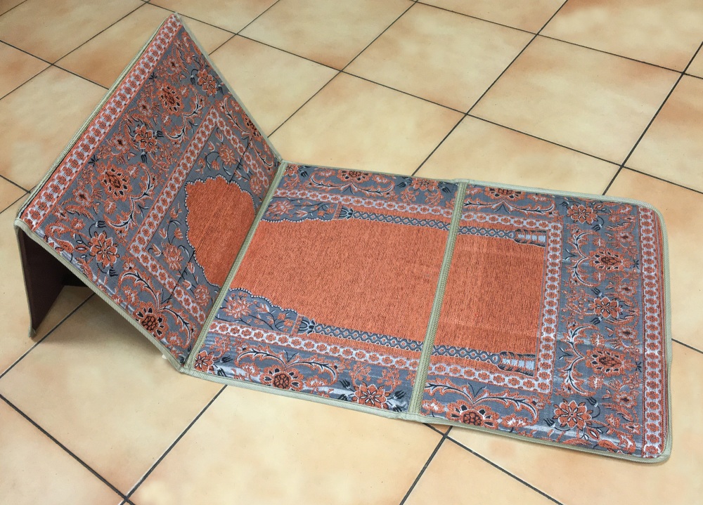 Une idée vraiment originale ! Ce tapis de prière peut se transformer en chaise pour s'adosser et reposer son dos. Pratique à prendre quand on doit passer un long moment à la mosquée ou pour les étudiants en cours à la mosquée, en pèlerinage, etc.