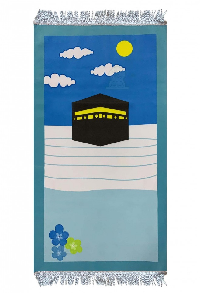 Tapis de priere (Sajjadat-Salat) pour enfants et ados musulmans avec dessin Kaaba - Couleur bleu ciel