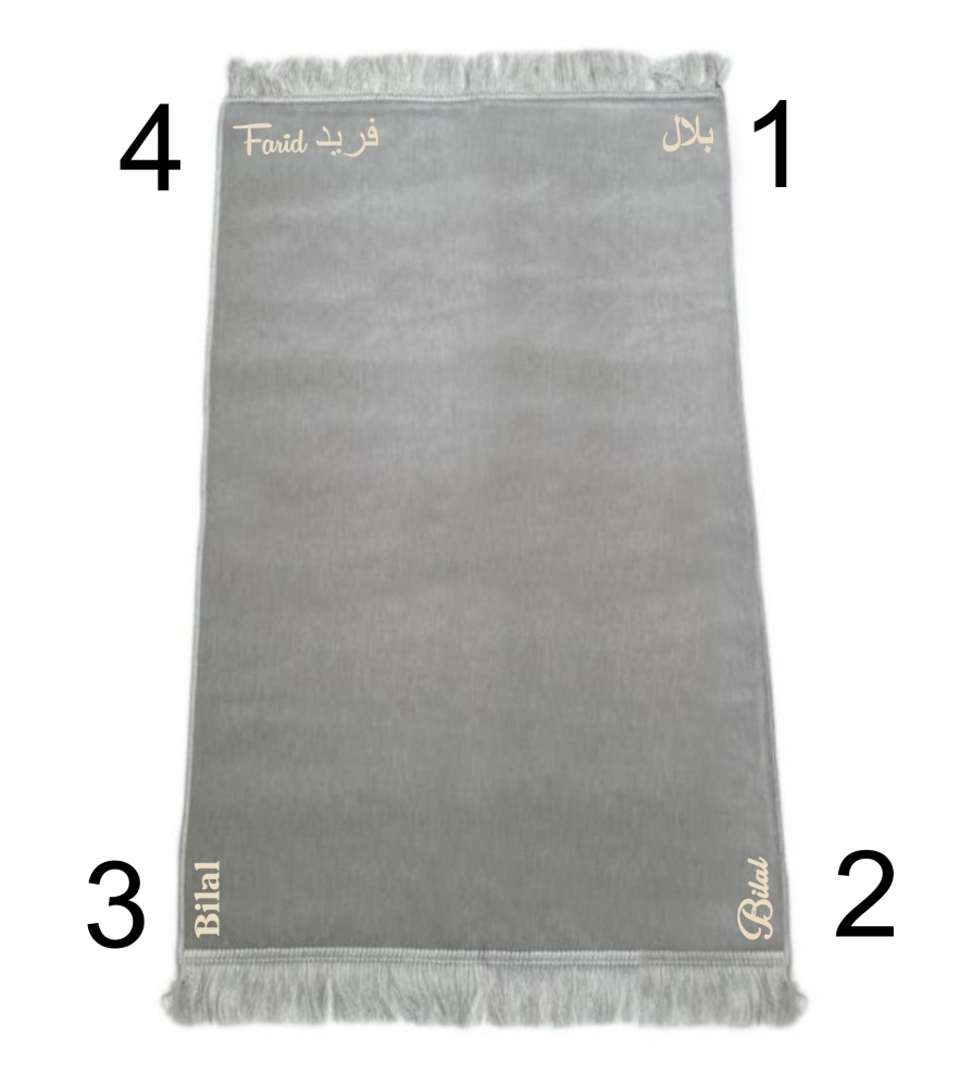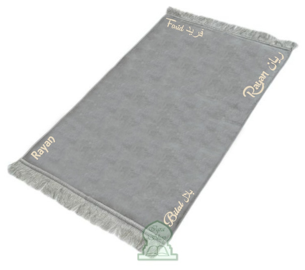 Tapis de priere adulte en velours couleur gris uni sans motifs personnalise avec le prenom de votre choix