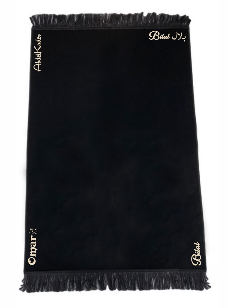 Tapis de priere adulte en velours couleur noir uni sans motifs personnalise avec le prenom de votre choix
