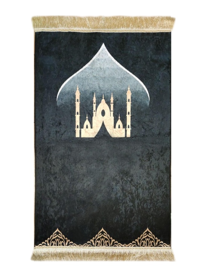 Tapis de priere de luxe anti-derapant de couleur Noir avec motifs et franges dores (70 x 115 cm)