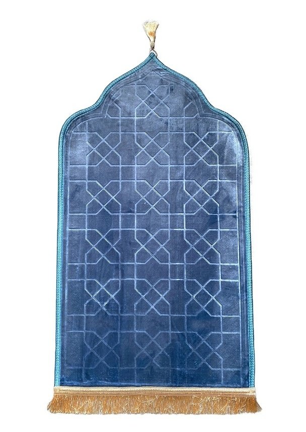 Tapis de priere original en forme de Mihrab avec parties dorees (Sajjada adulte Design Mehrab / Mosquee) - Couleur bleu ocean