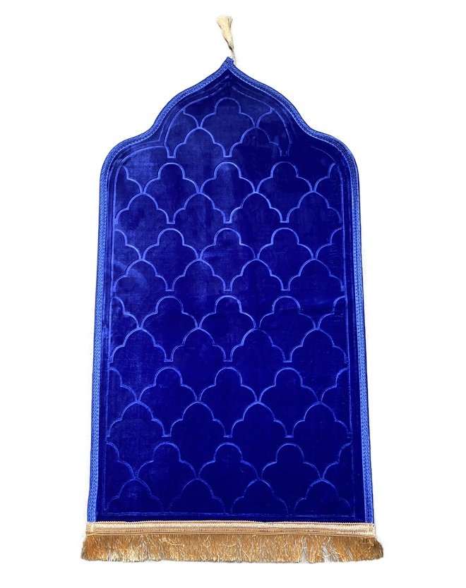 Tapis de priere original en forme de Mihrab avec parties dorees (Sajjada adulte Design Mehrab / Mosquee) - Couleur bleu roi