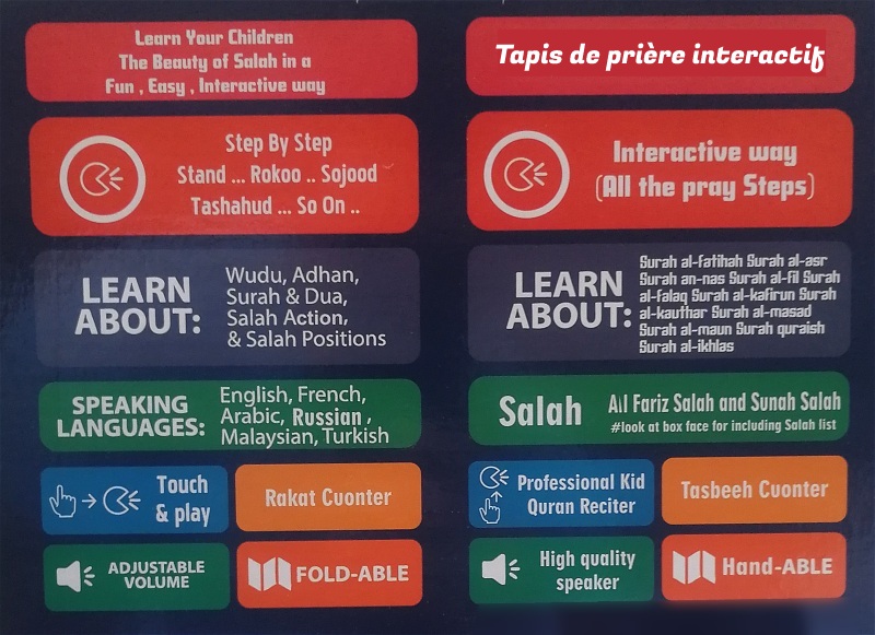 Ce tapis interactif est un outil pédagogique pour l'apprentissage précis de la prière tant au niveau des gestes que des paroles. Ce tapis interactif et pédagogique permet aux enfants comme aux adultes qui débutent la pratique de la prière, d’en faciliter l'apprentissage de façon autonome.