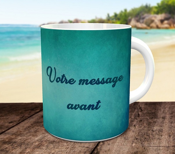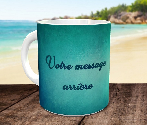 Tasse personnalisee avec deux messages avant et arriere (Mug fond bleu vert et texte)