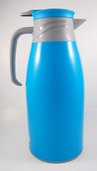 Thermos en plastique bleue de capacité de 1,9L. le couvercle dispose d'un bouton à pression pour ouvrir le bec verseur afin de verser de la boisson, puis une fois le bouton relâché le bec verseur est à nouveau fermé, et la boisson reste isolée à la même température (quelle soit chaude ou froide).