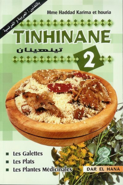 Tinhinane 2 est un livre de recettes présentée par Mme. Haddad Karima et Houria. Ce numéro contient différentes recettes telles que les galettes, les plats ainsi que les plantes médicinales avec des images illustrées en Arabe et Français.