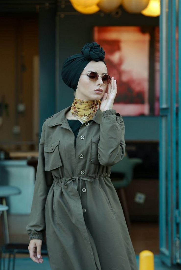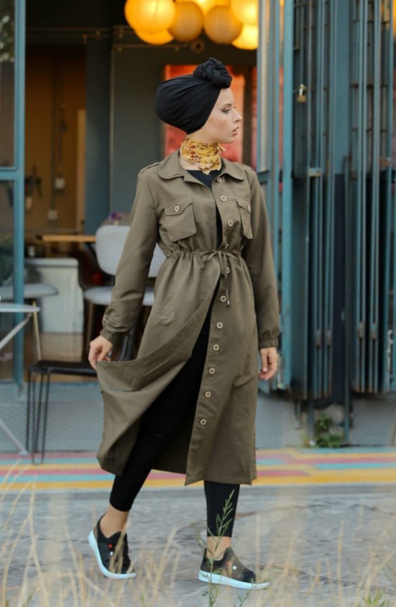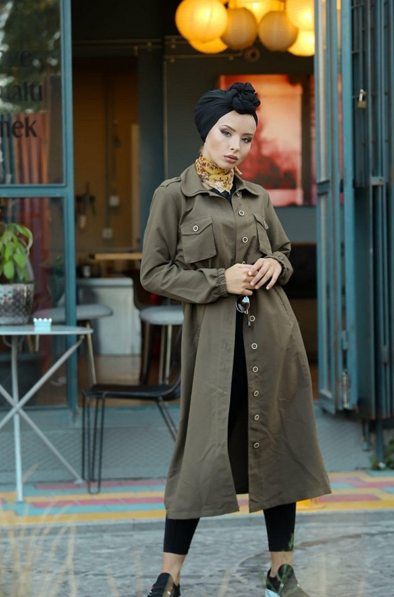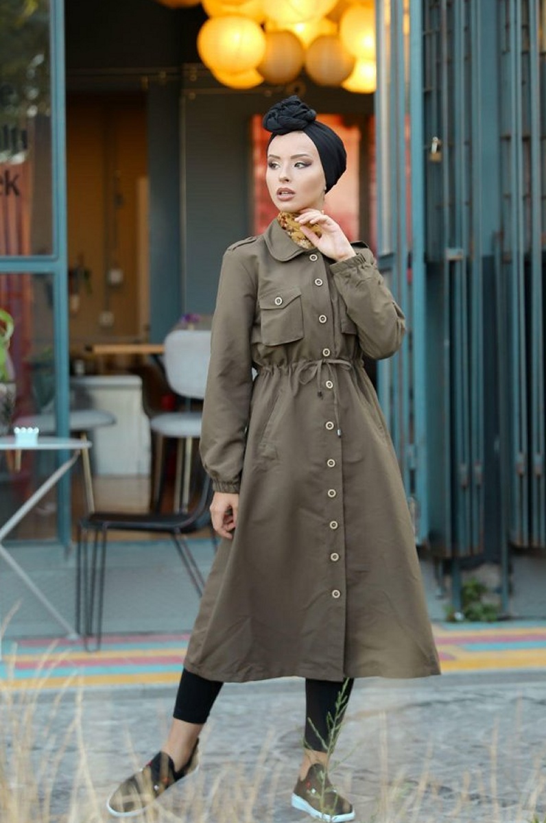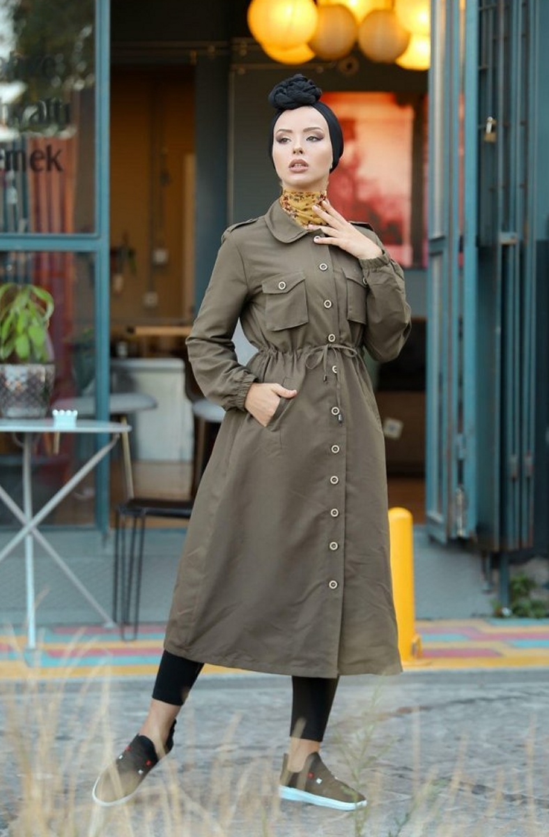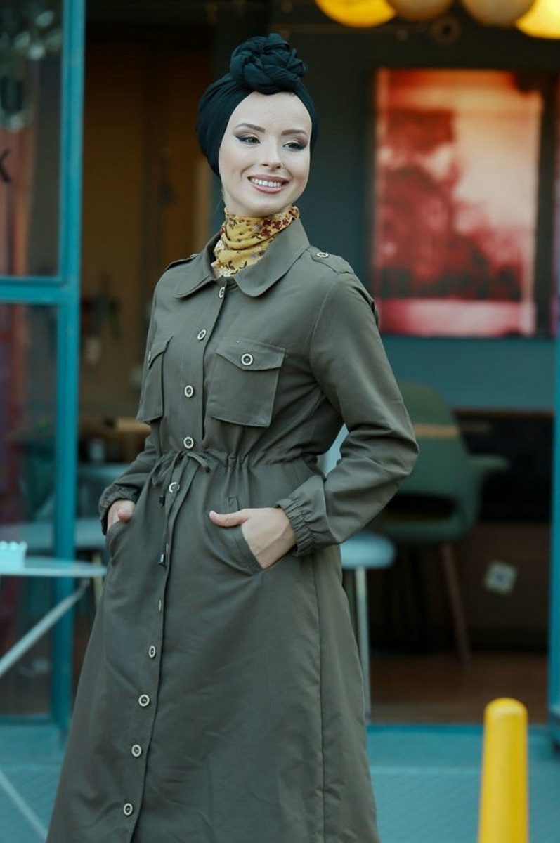 Trench-coat et robe mi longue, manches longues finition élastiques aux poignets, col chemise, deux poches plaquées + 2 poches latérales, cordon de serrage, fermeture boutons sur toute la longueur.