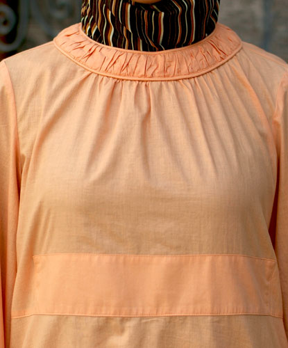 Description: hits mid-thigh; wide, rounded neckline with gathers and piping; rear button opening; wide, flared cut with inside tie to tighten as desired; tie attached to inset waistband; peasant sleeves gathered into a loose buttoned cuff. Imported.