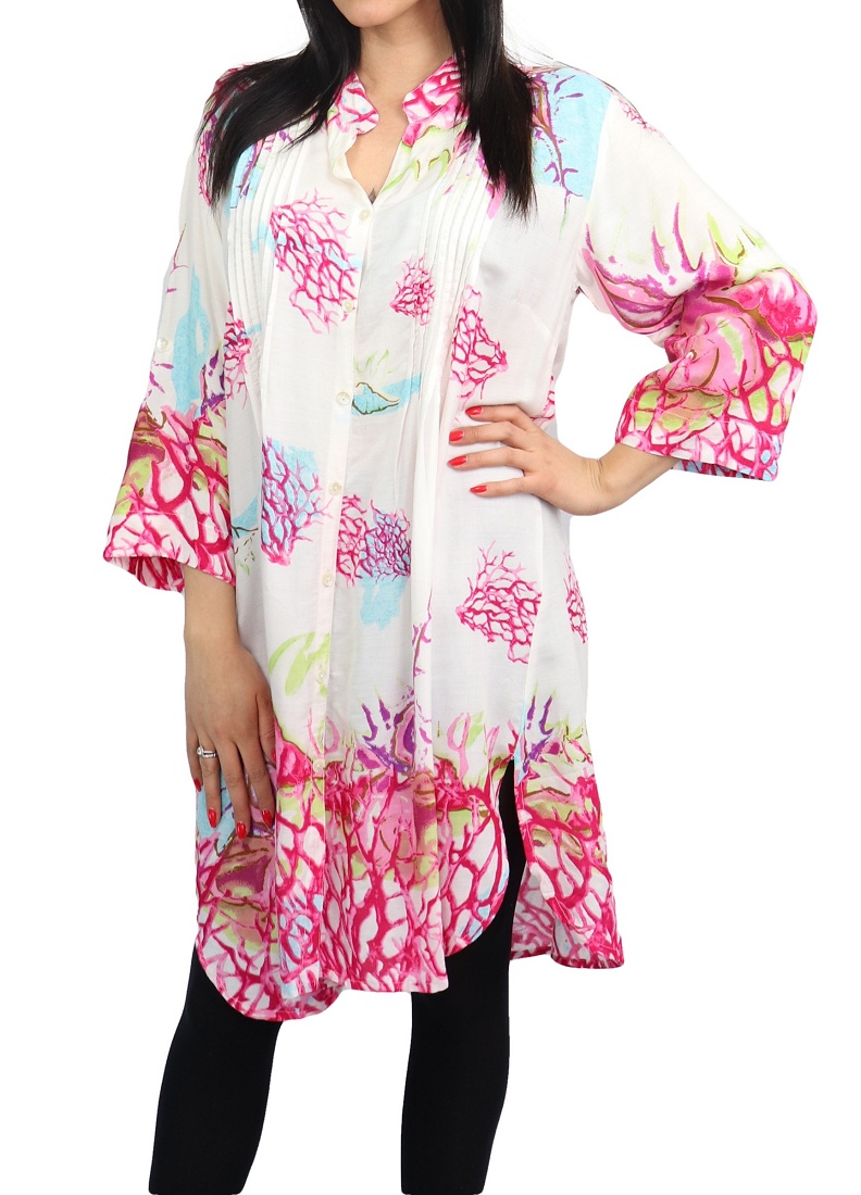 Tunique-Chemise ample blanche imprimée motifs fleurs fuchsia et bleu Vetement & Accessoire
