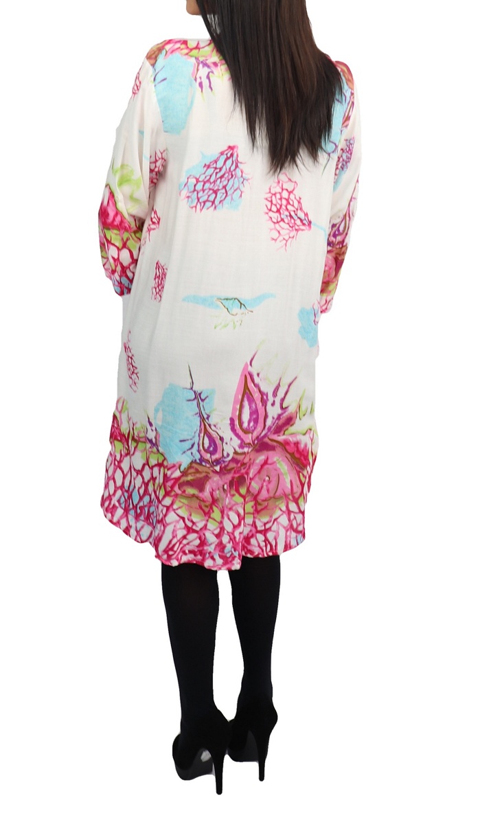 Tunique-Chemise ample blanche imprimee motifs fleurs fuchsia et bleu