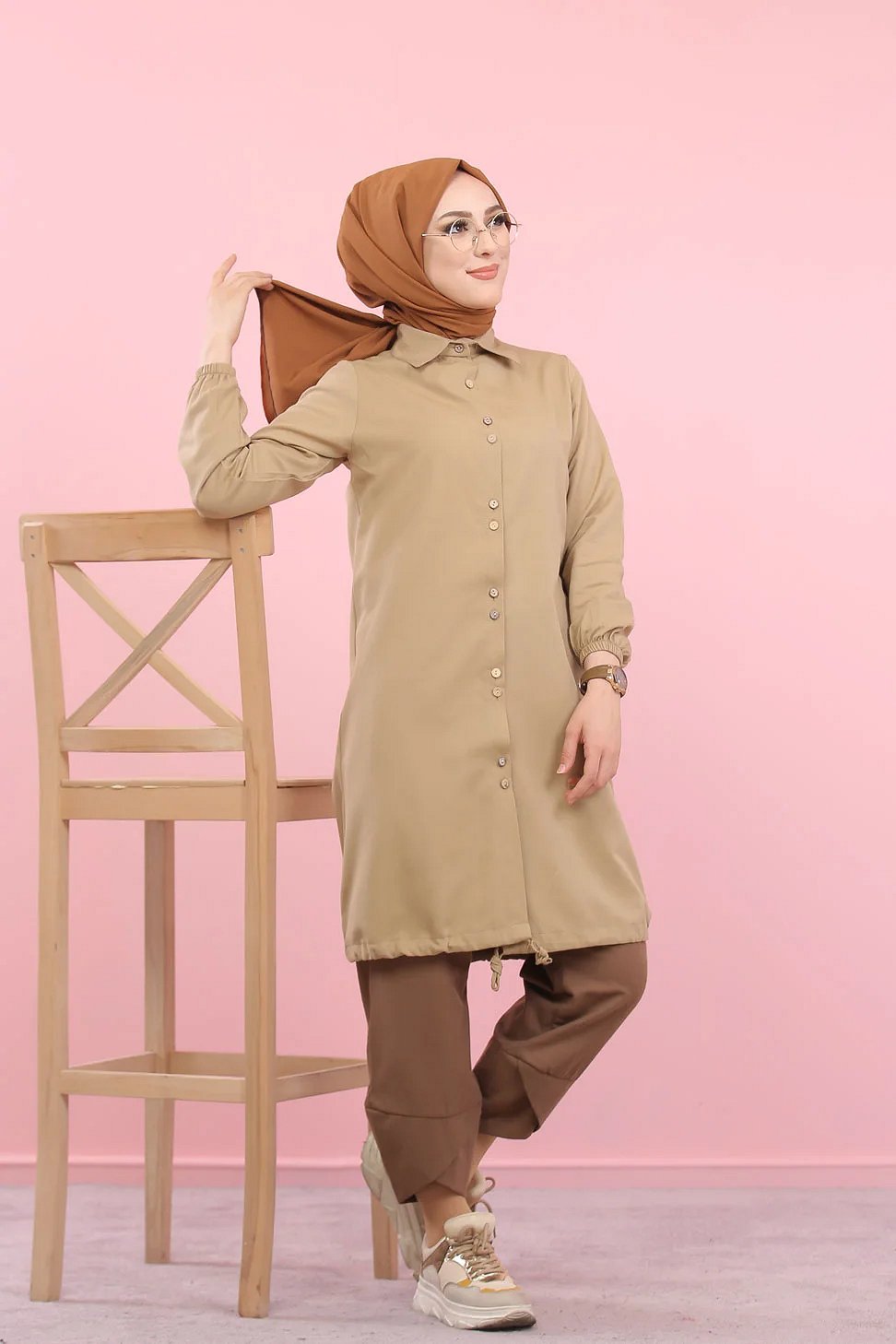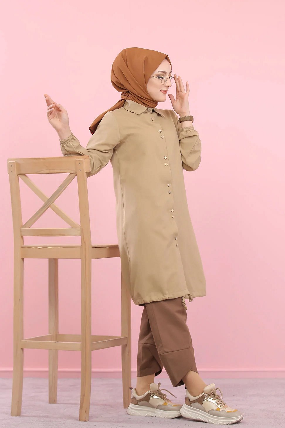 Tunique-Chemise ample boutonnée (Vetement décontracté femme voilée) - Couleur Beige foncé Vetement & Accessoire