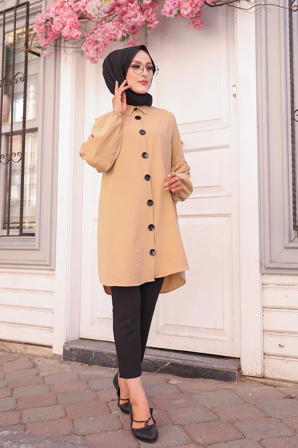 Tunique-Chemise ample boutonnée (Vetement décontracté femme voilée) - Couleur Beige - REF. 33197 (25.00 €)