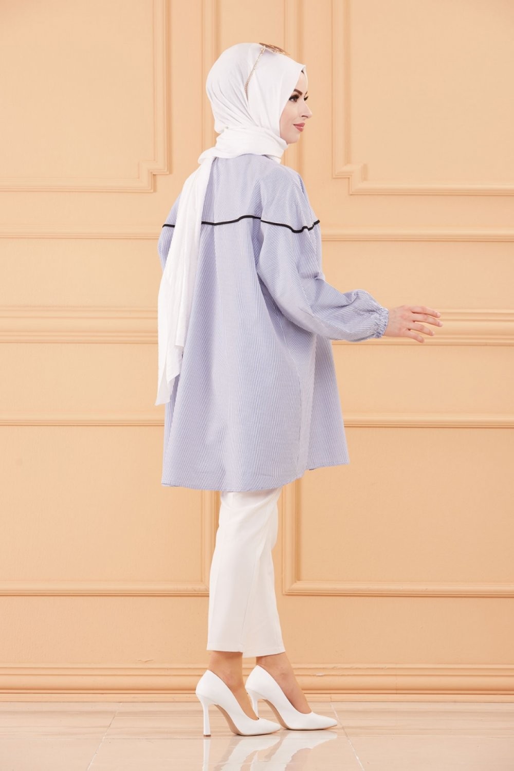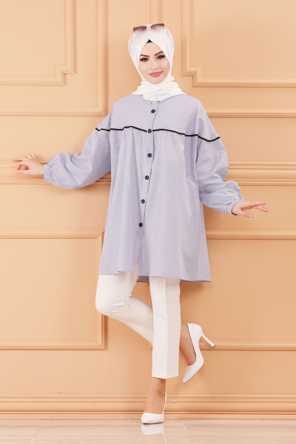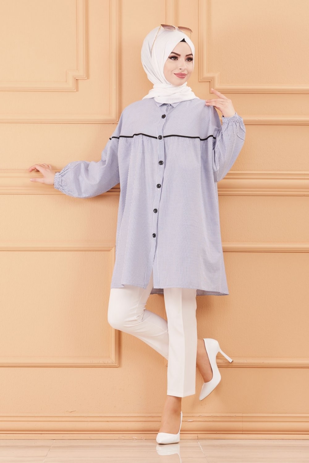 Tunique-Chemise ample style habillé (Vêtement femme voilée turque) - Rayures de couleur bleu Vetement & Accessoire