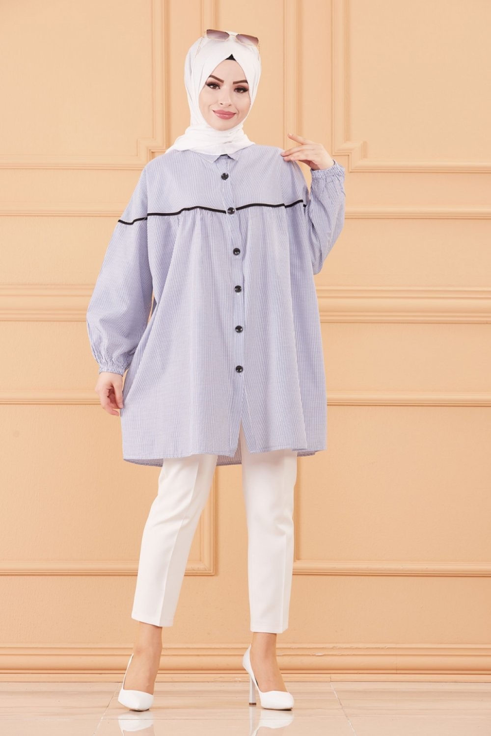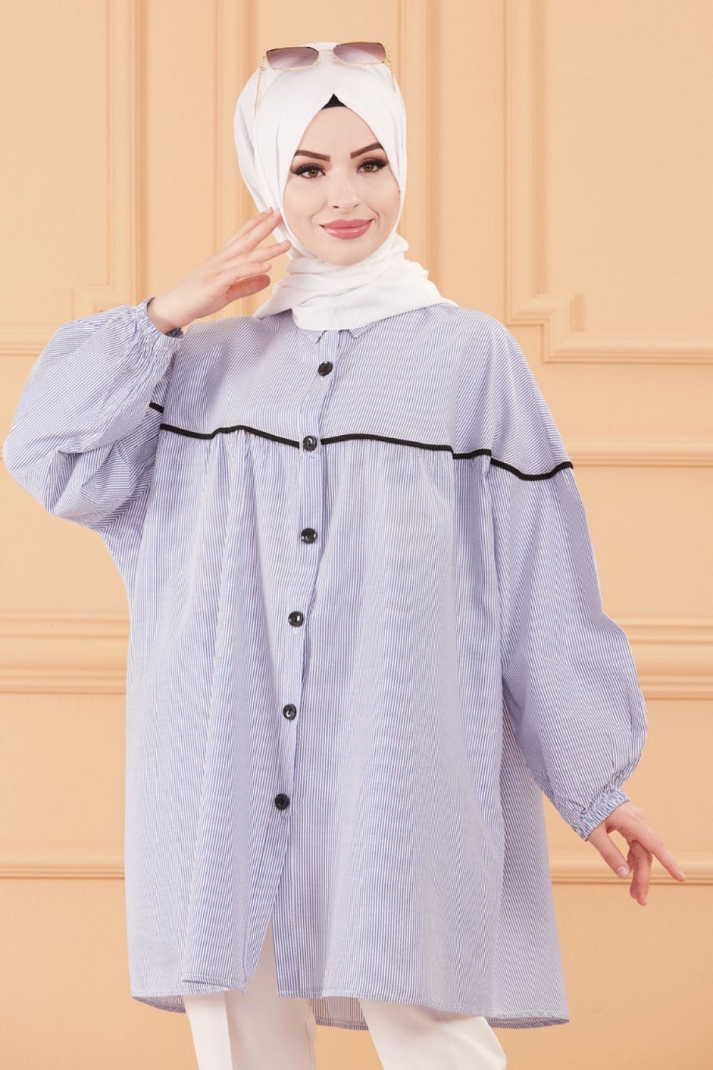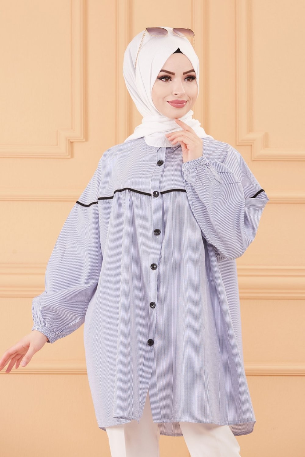 Tunique-Chemise ample style habille (Vetement femme voilee turque) - Rayures de couleur bleu