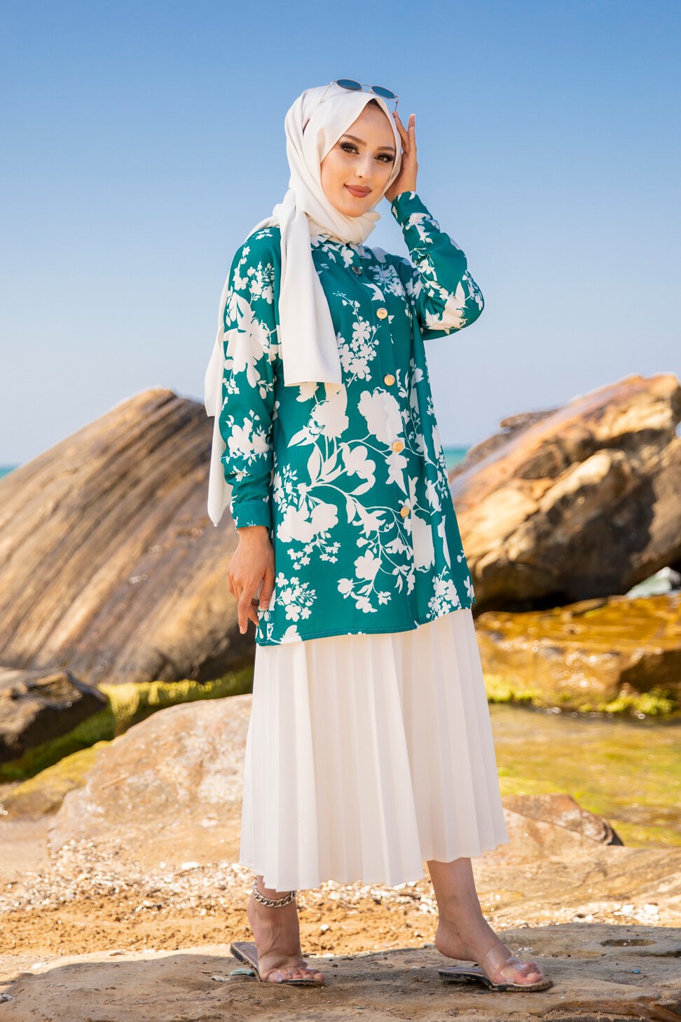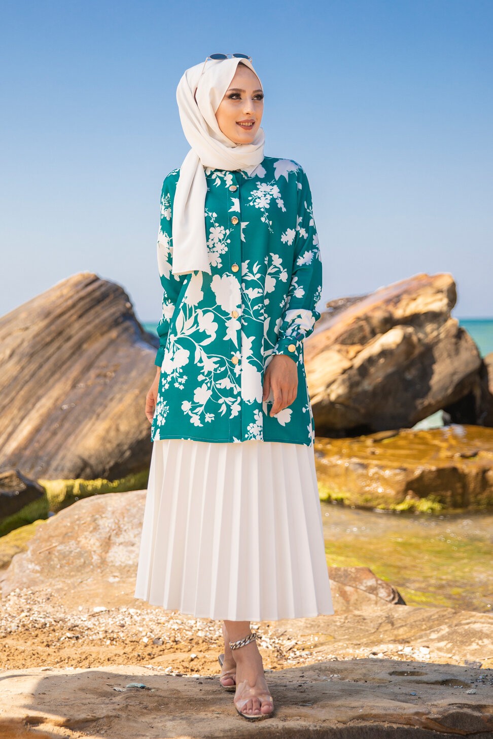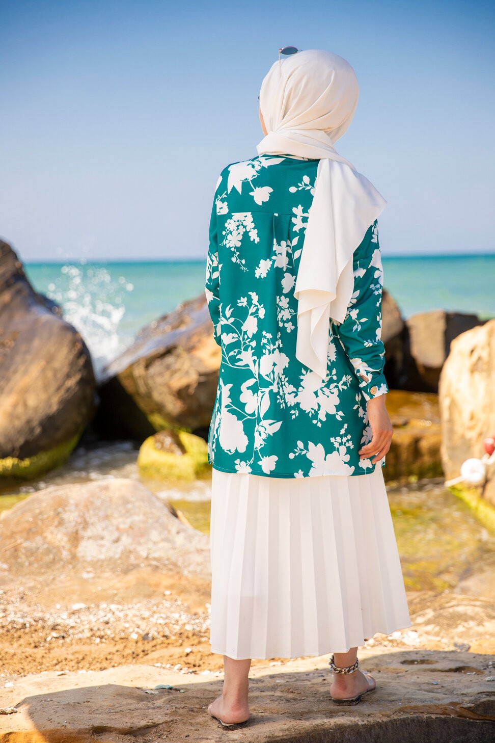 Chemise fleurie, manches finition boutons, coupe droite, tissu effet crêpe.