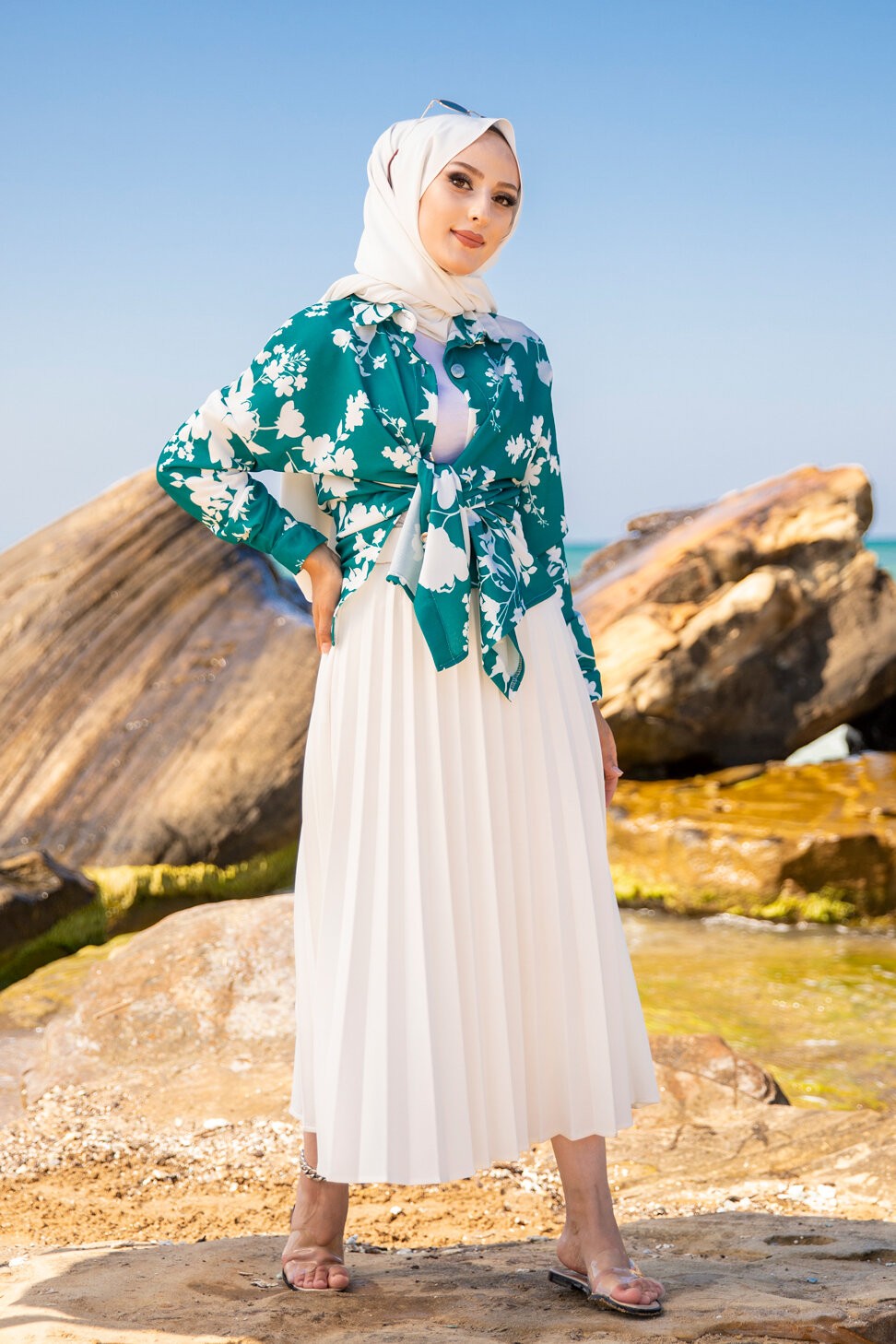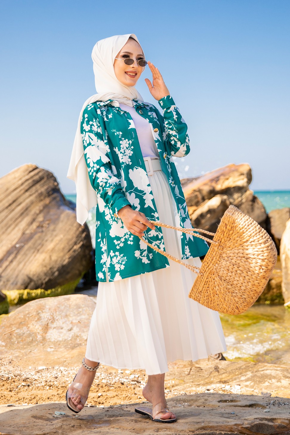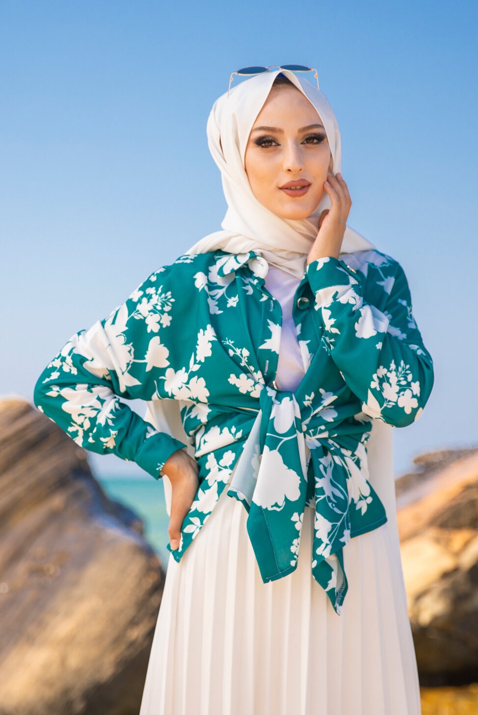 Chemise fleurie, manches finition boutons, coupe droite, tissu effet crêpe.