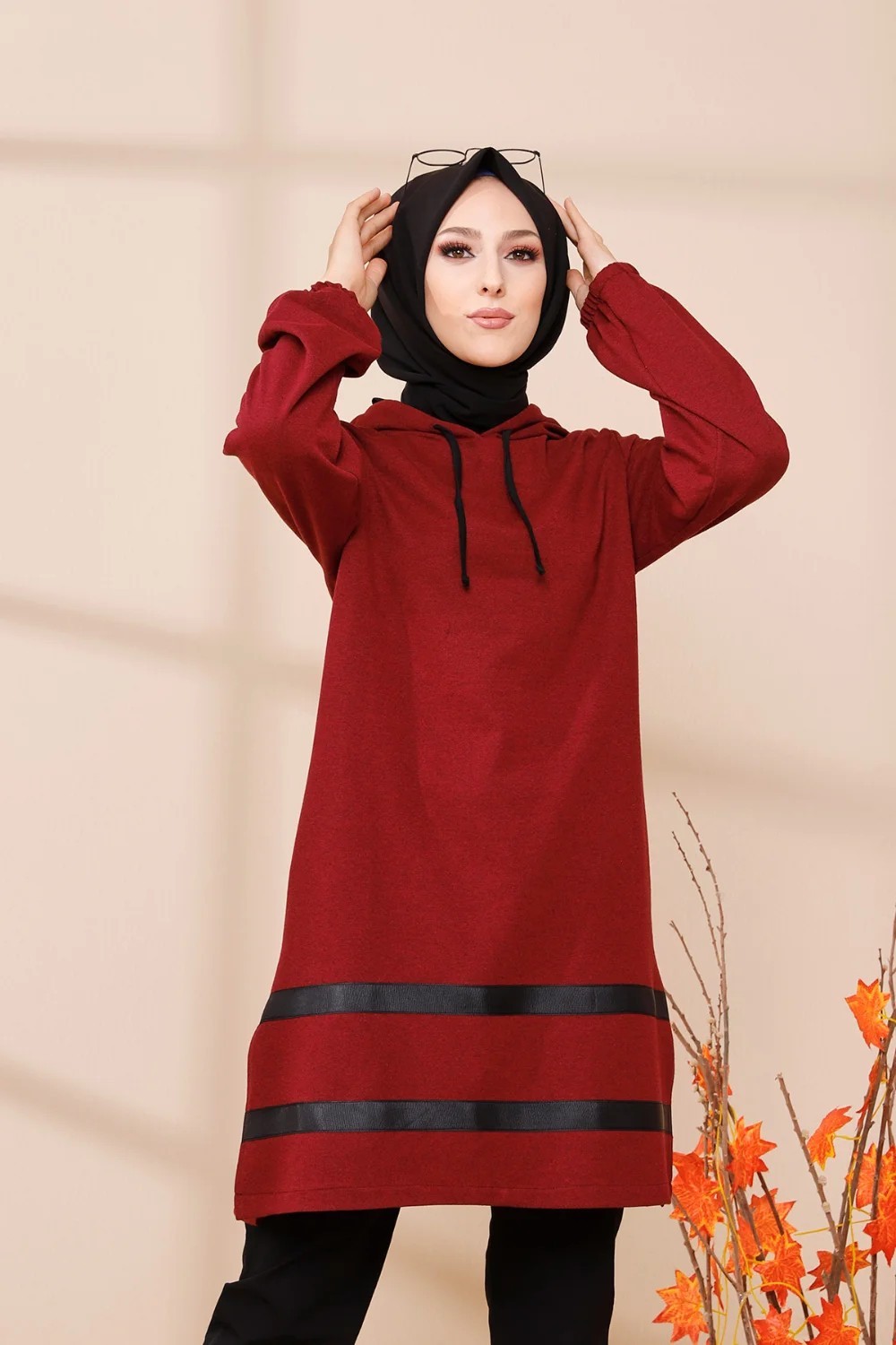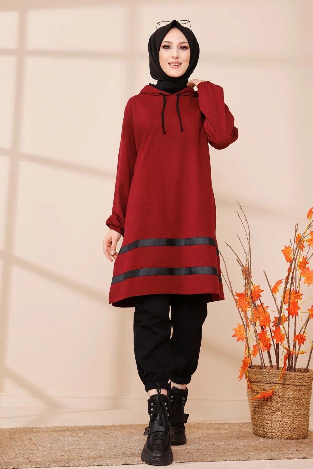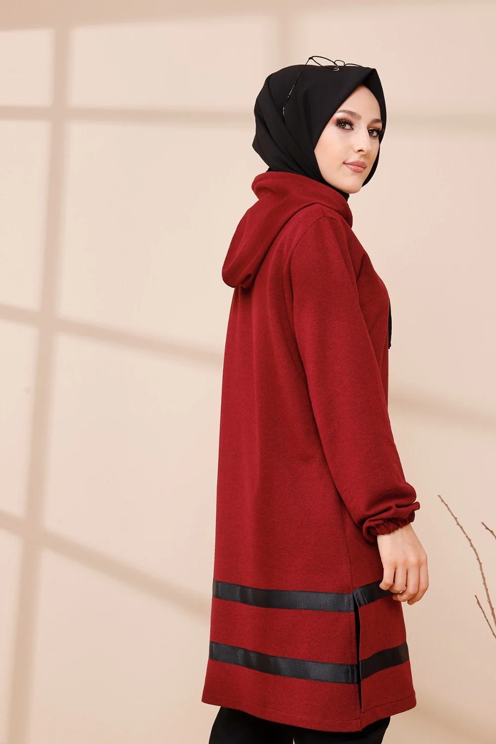 Tunique a capuche et bandes noires (Tenue moderne pour femme voilee) - Couleur bordeaux