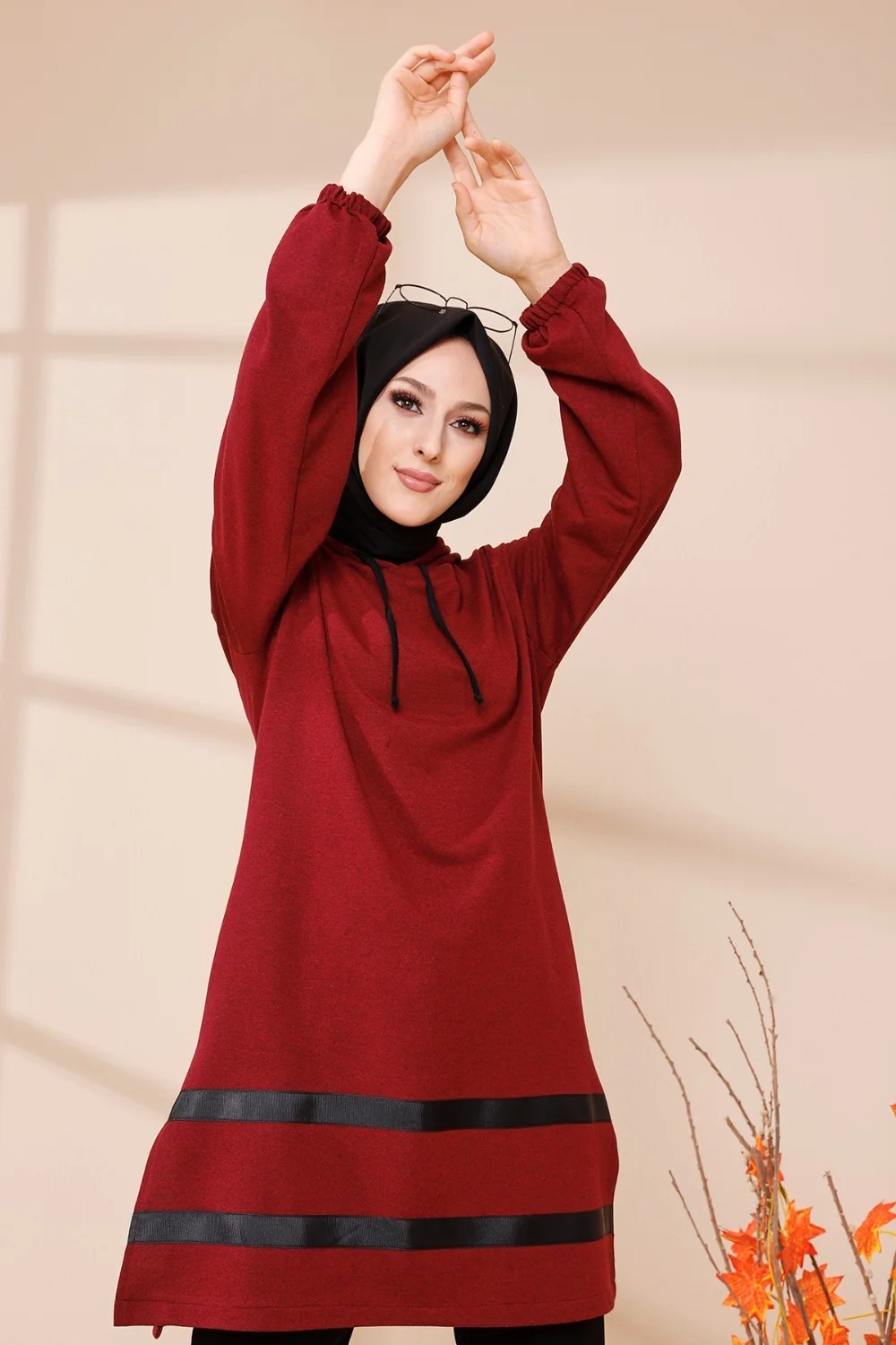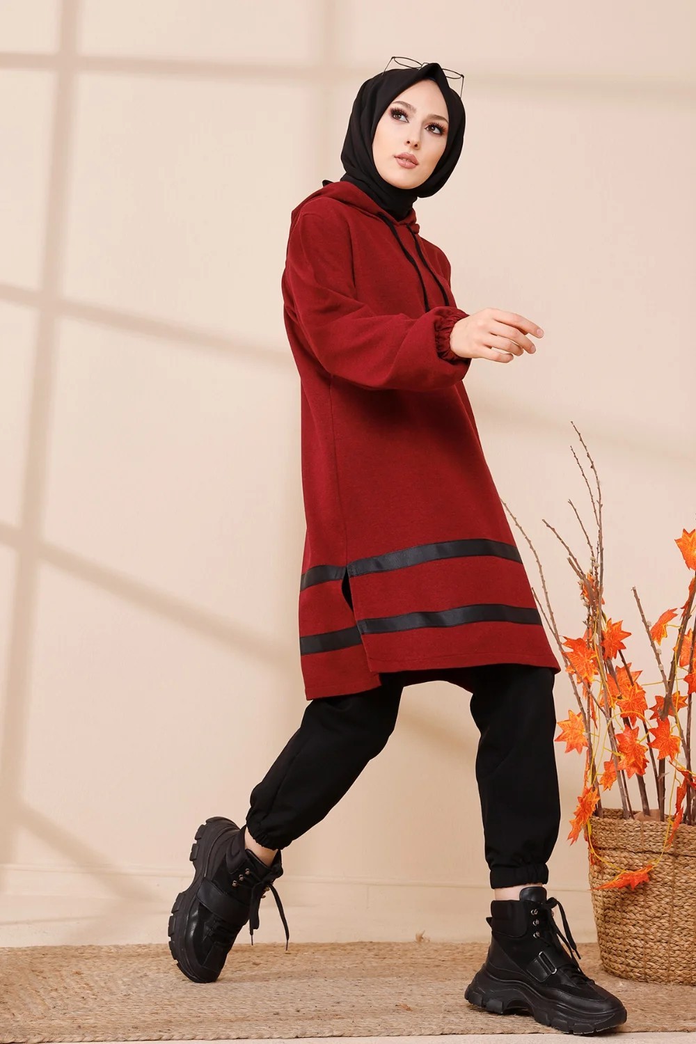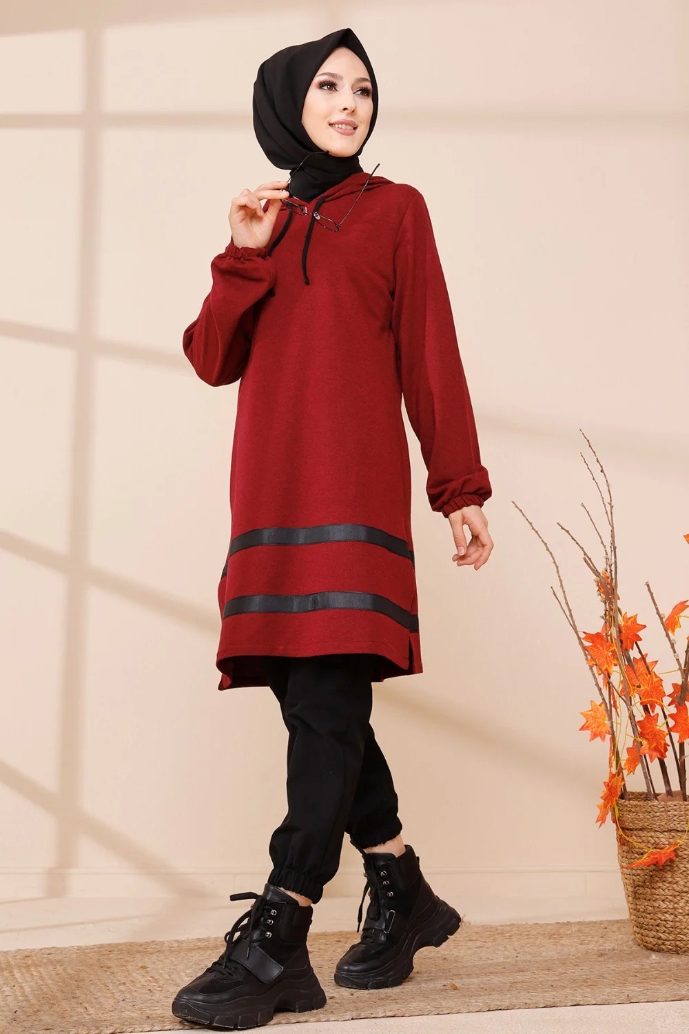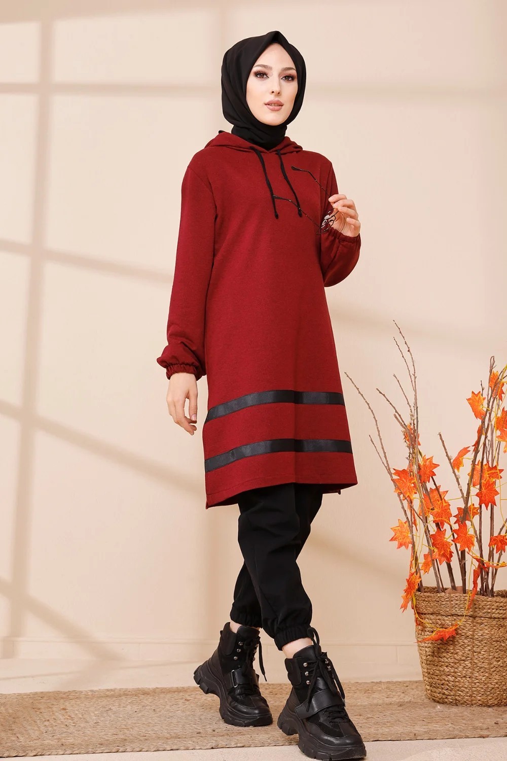 Tunique a capuche et bandes noires (Tenue moderne pour femme voilee) - Couleur bordeaux