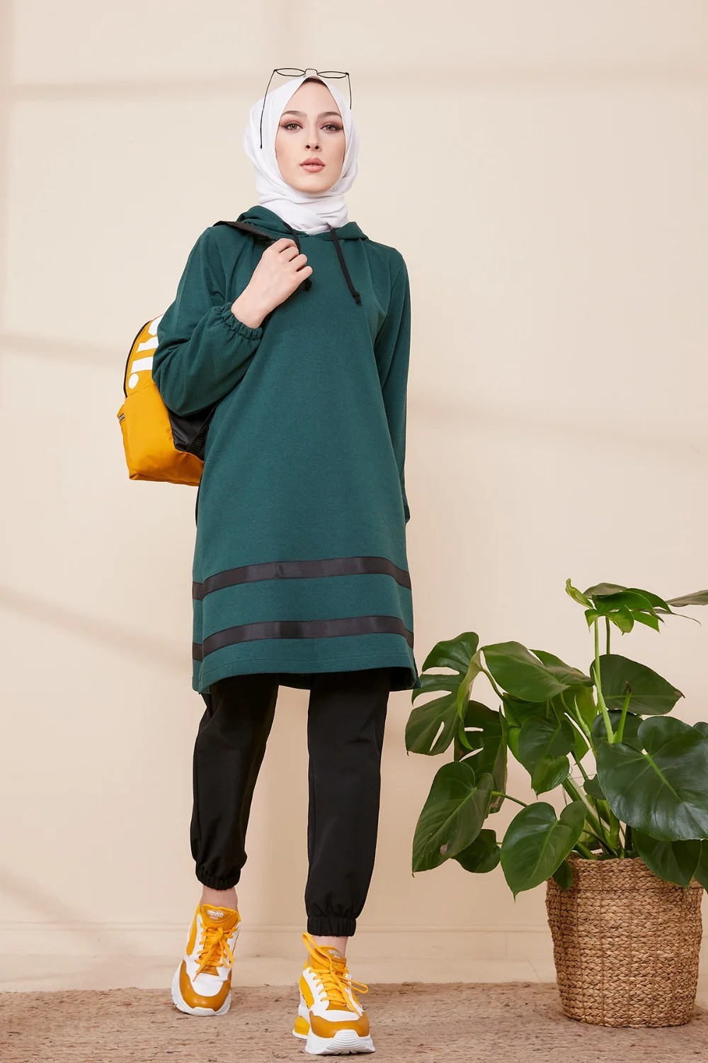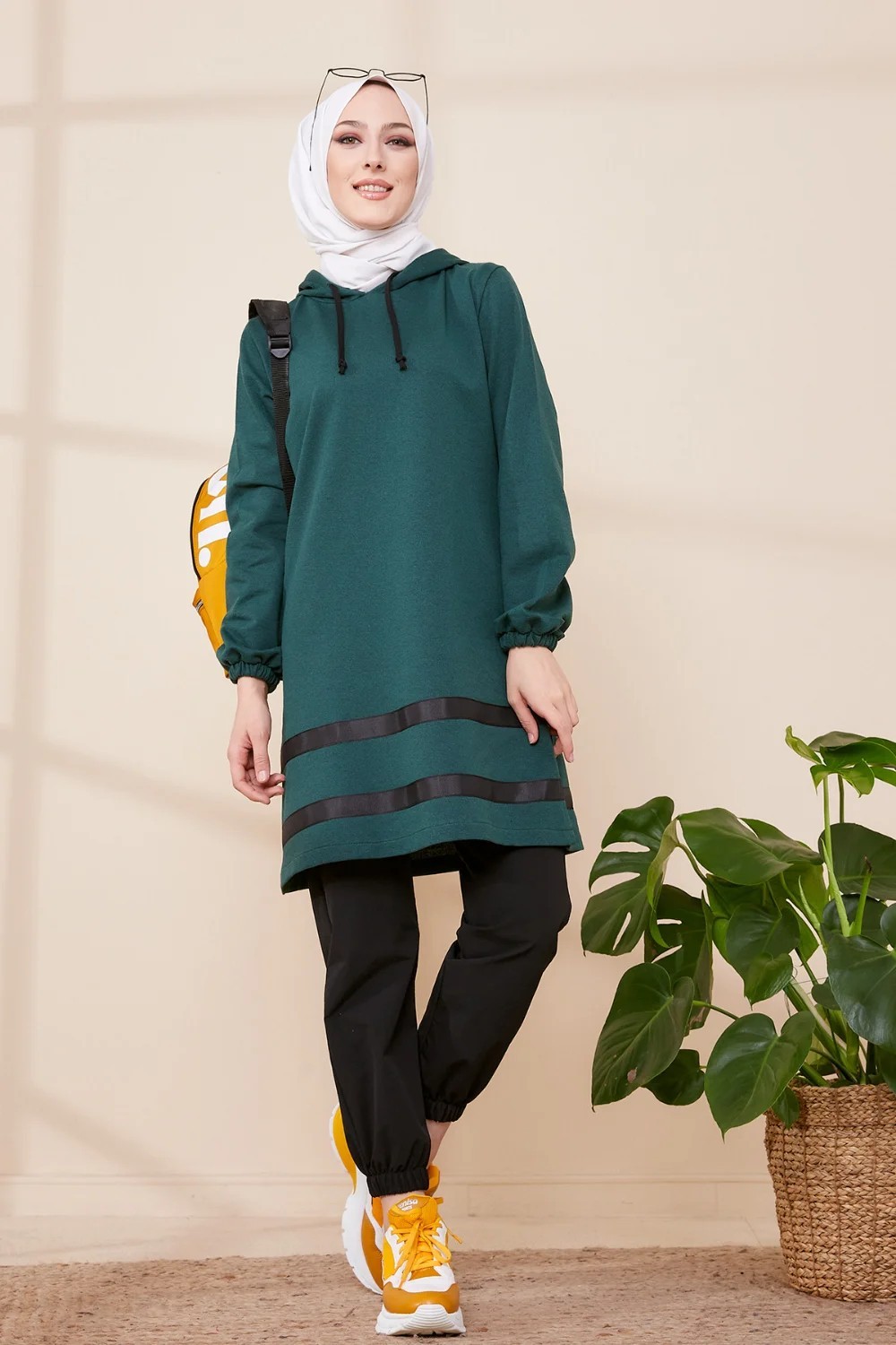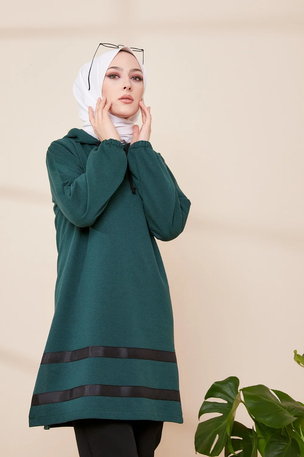 Tunique a capuche et bandes noires pour femme (Nouvelle Collection) - Couleur vert emeraude