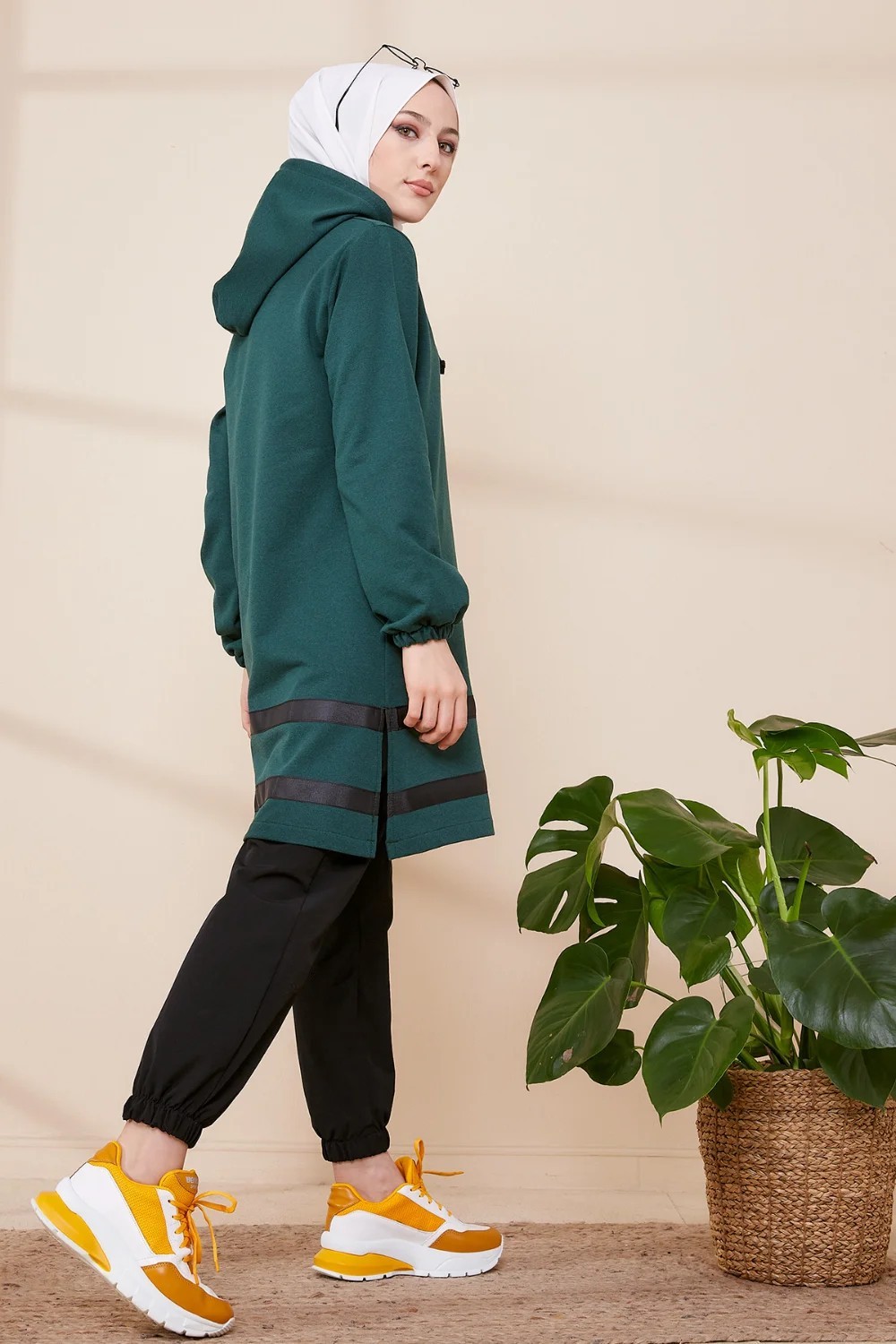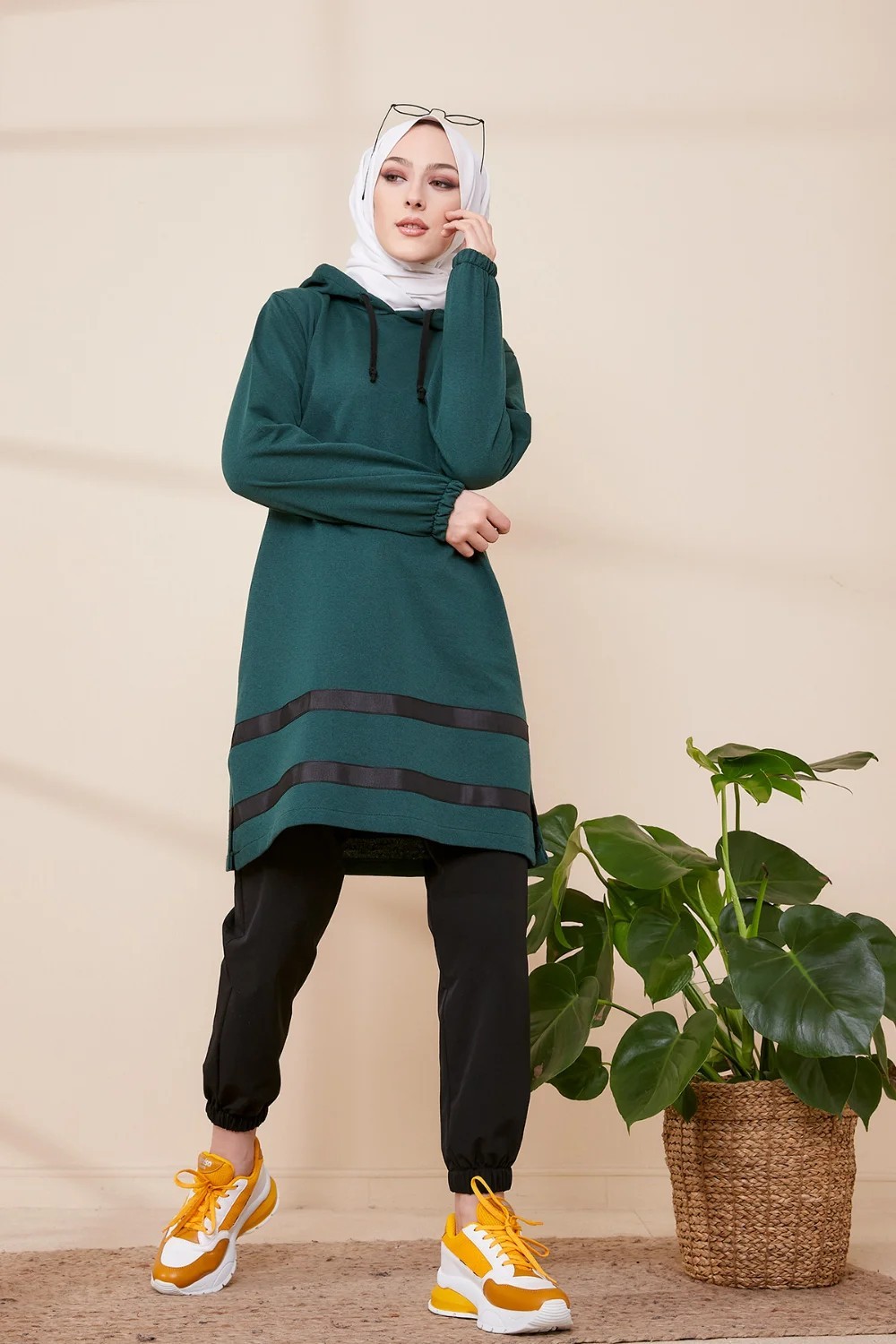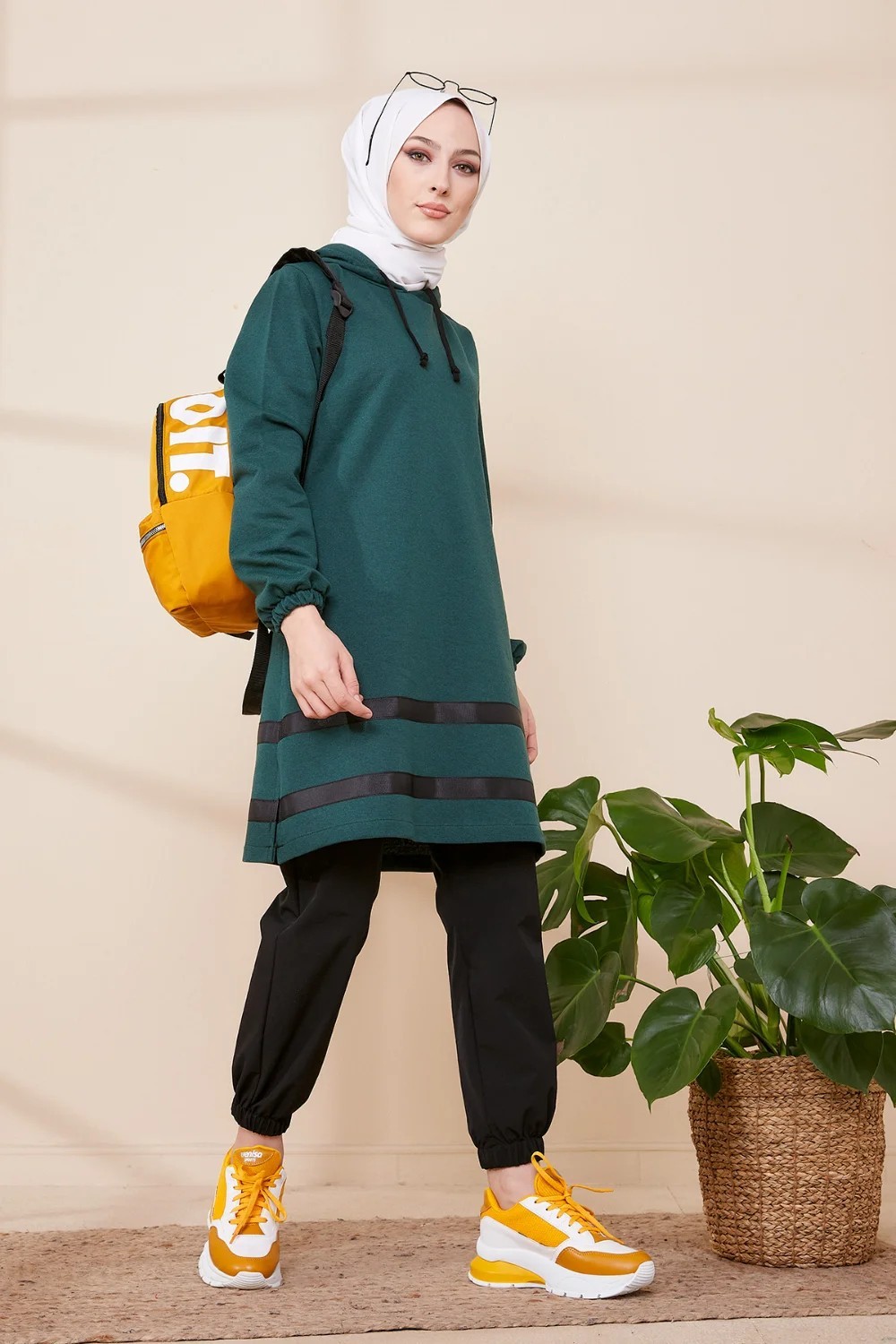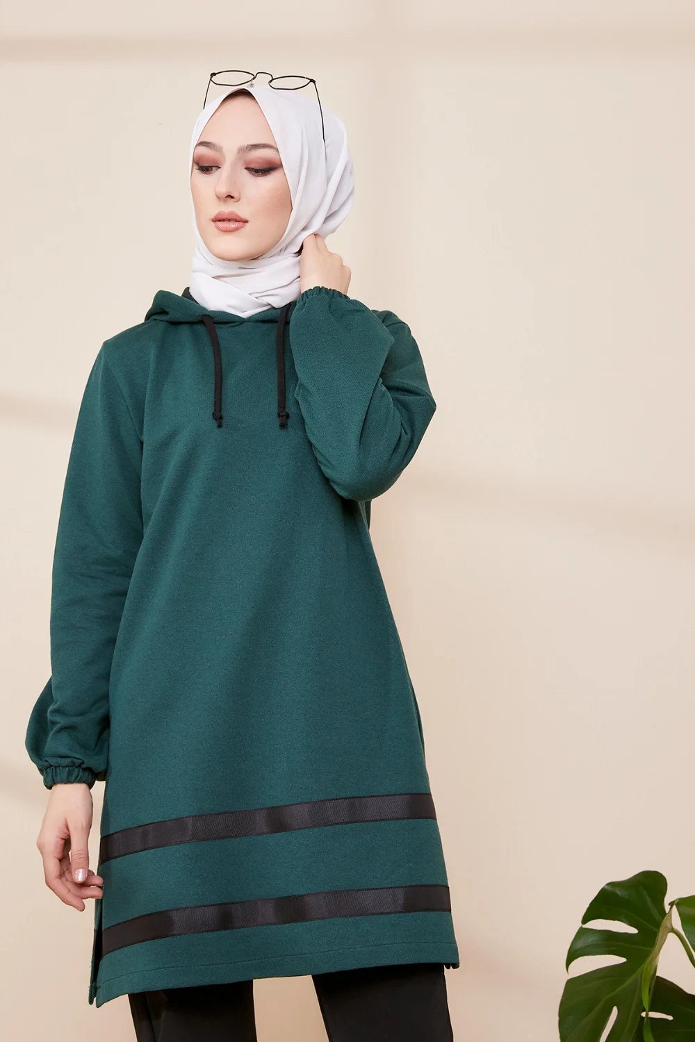 Tunique a capuche et bandes noires pour femme (Nouvelle Collection) - Couleur vert emeraude