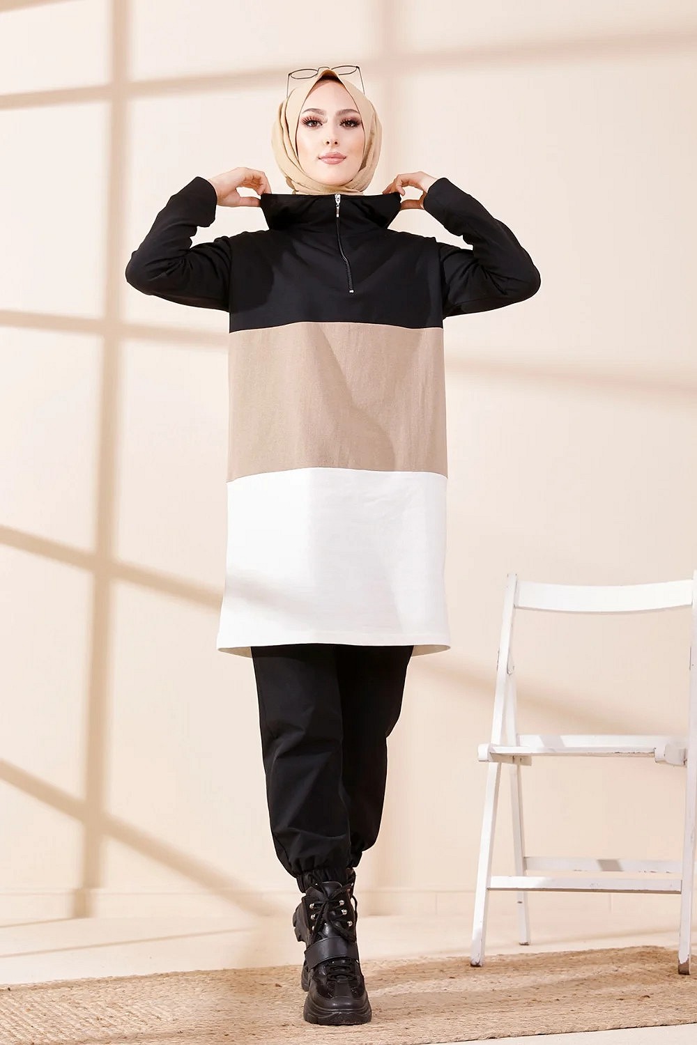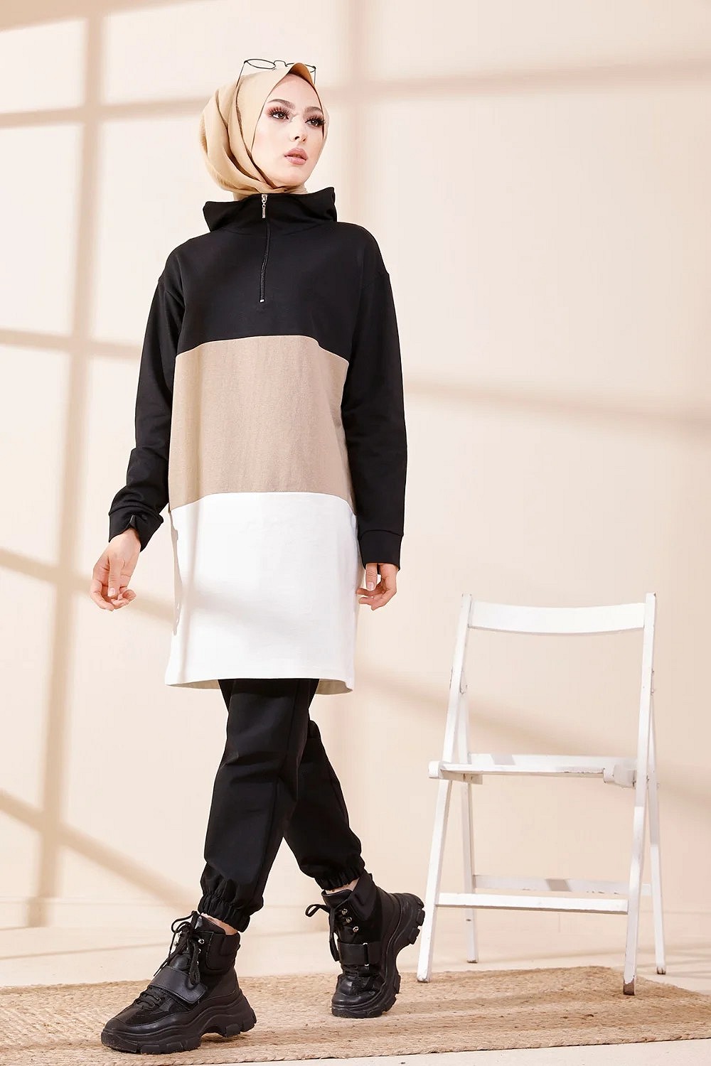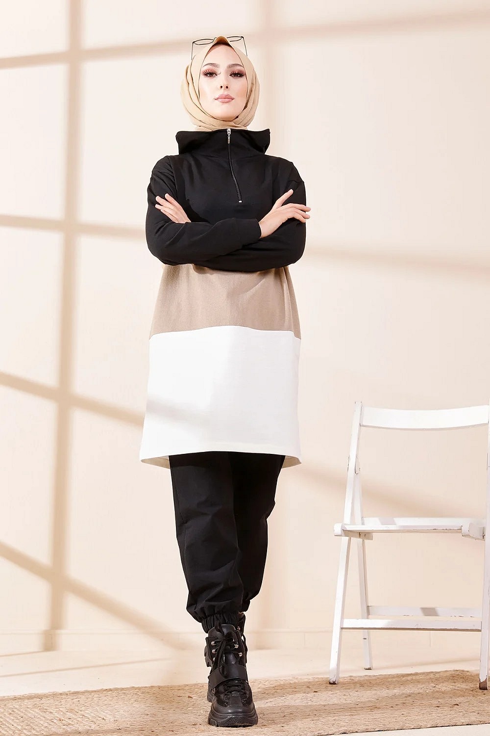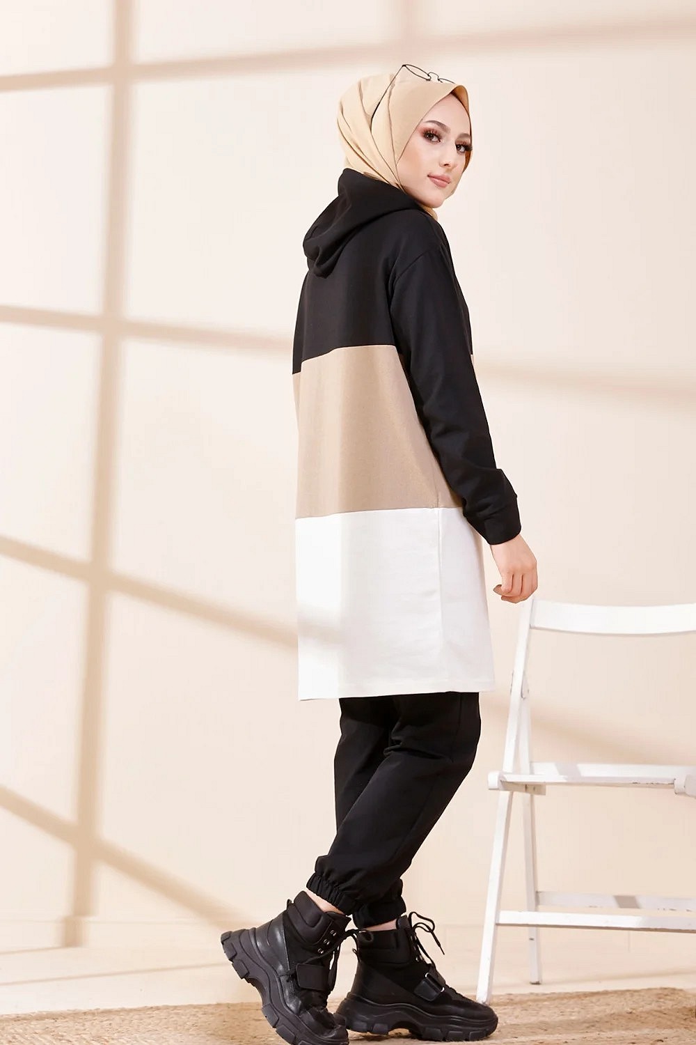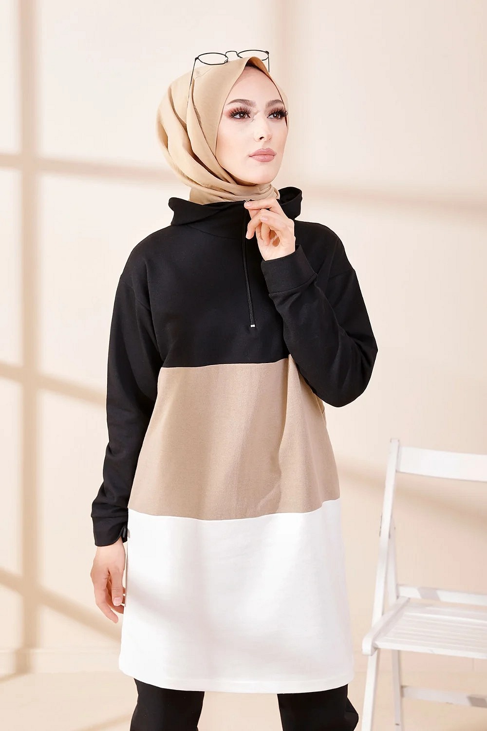 Tunique à capuche tricolore (Vêtement décontracté moderne pour femme voilée) - Couleur noir, blanc et vison Vetement & Accessoire