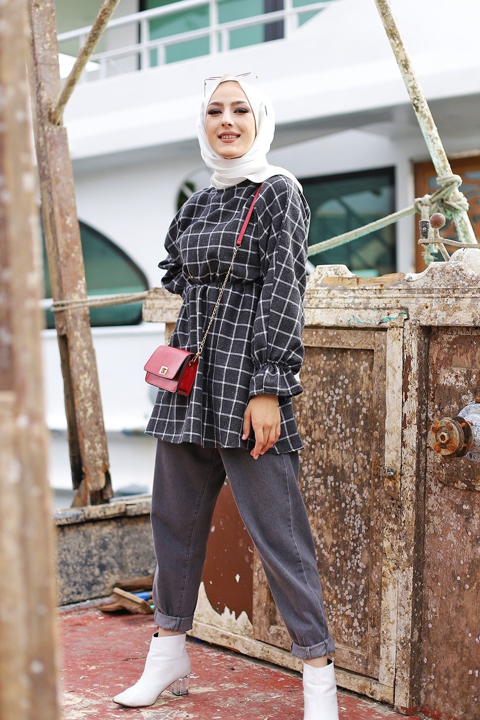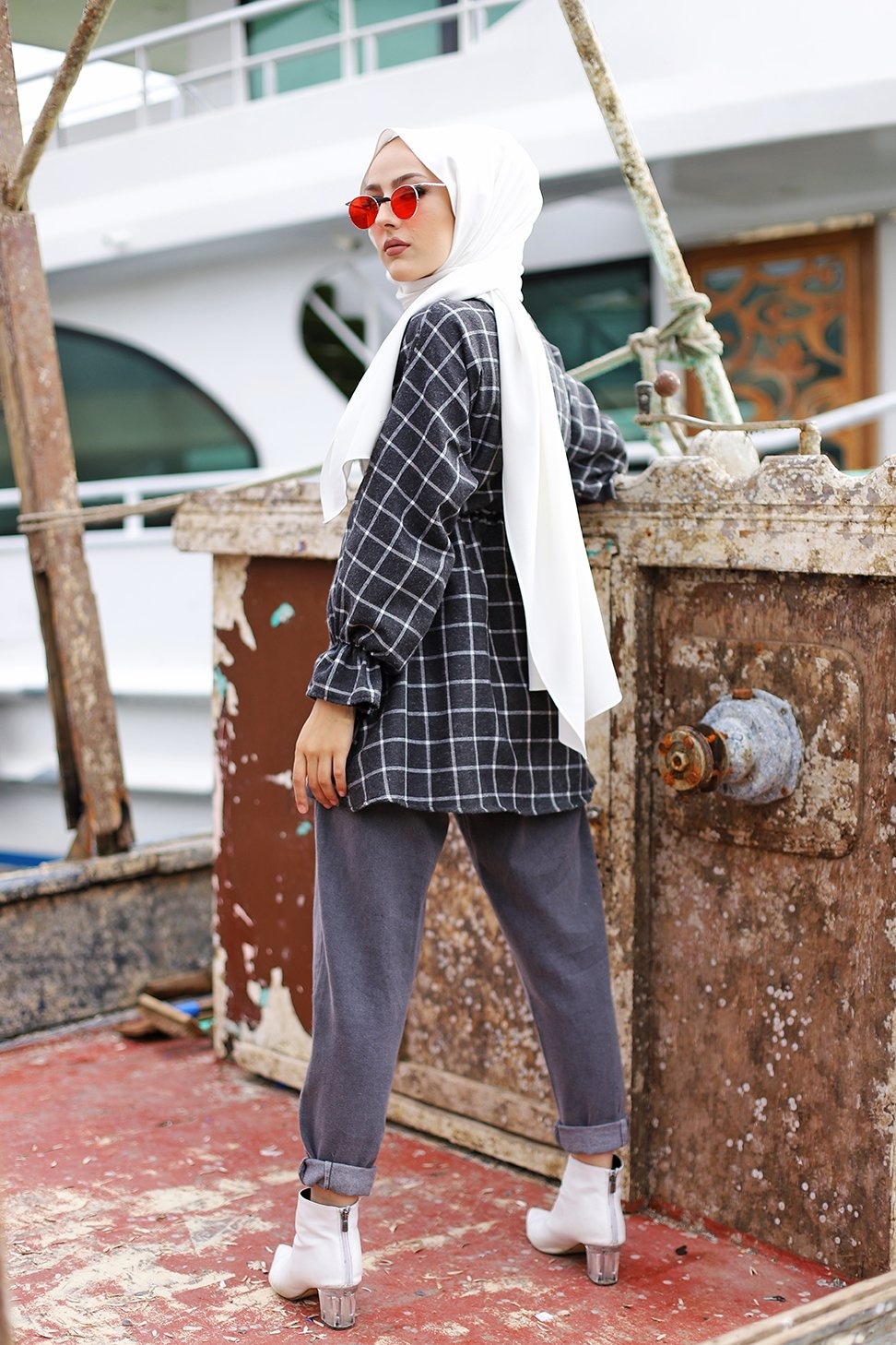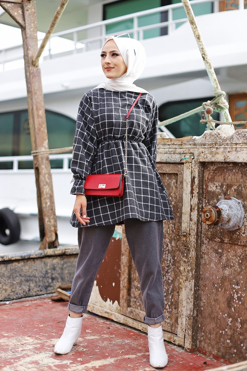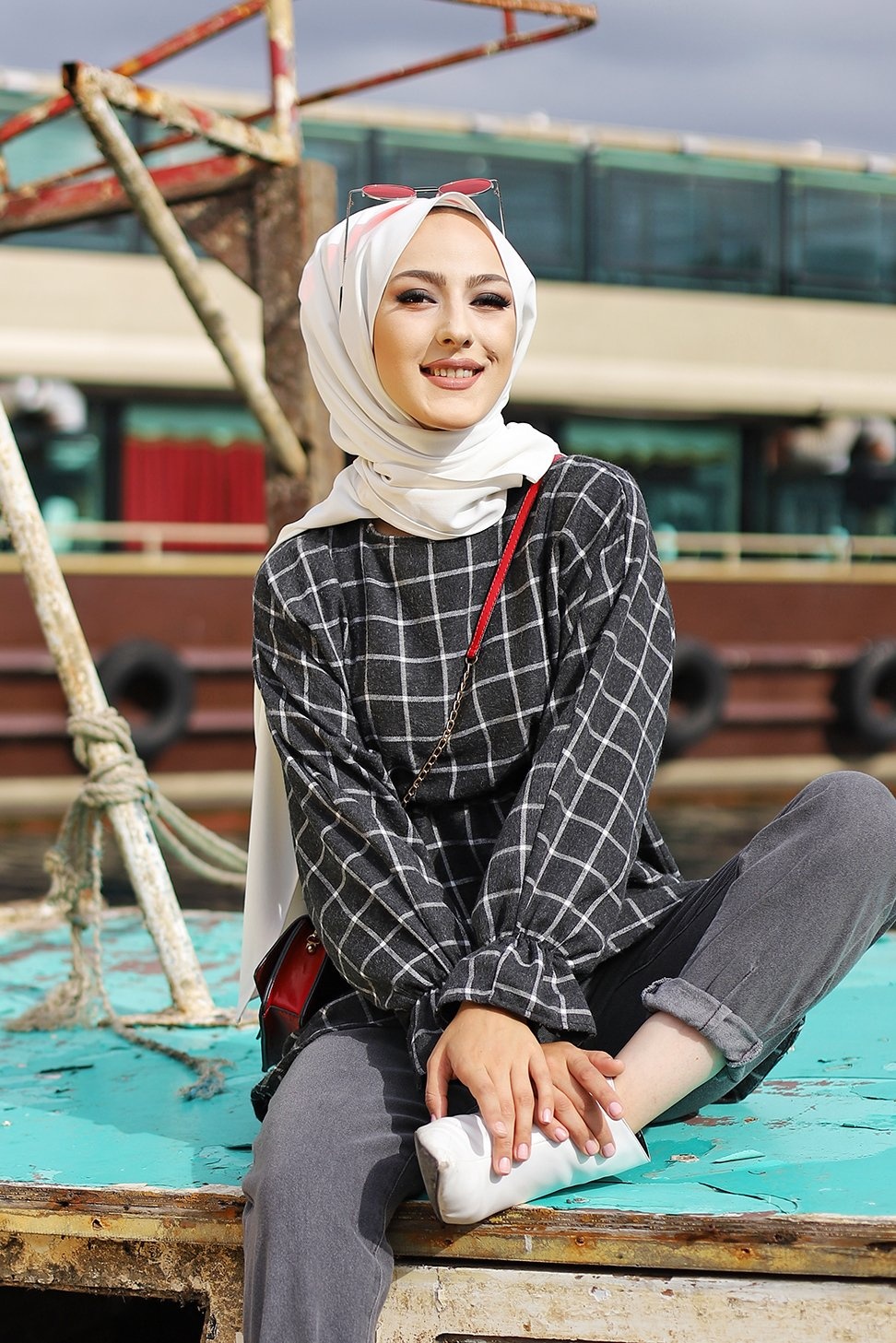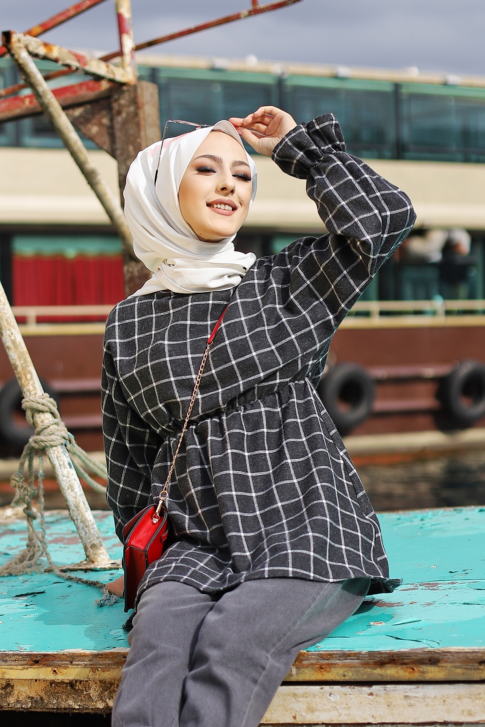 Tunique a carreaux pour femme - Couleur anthracite et ecru