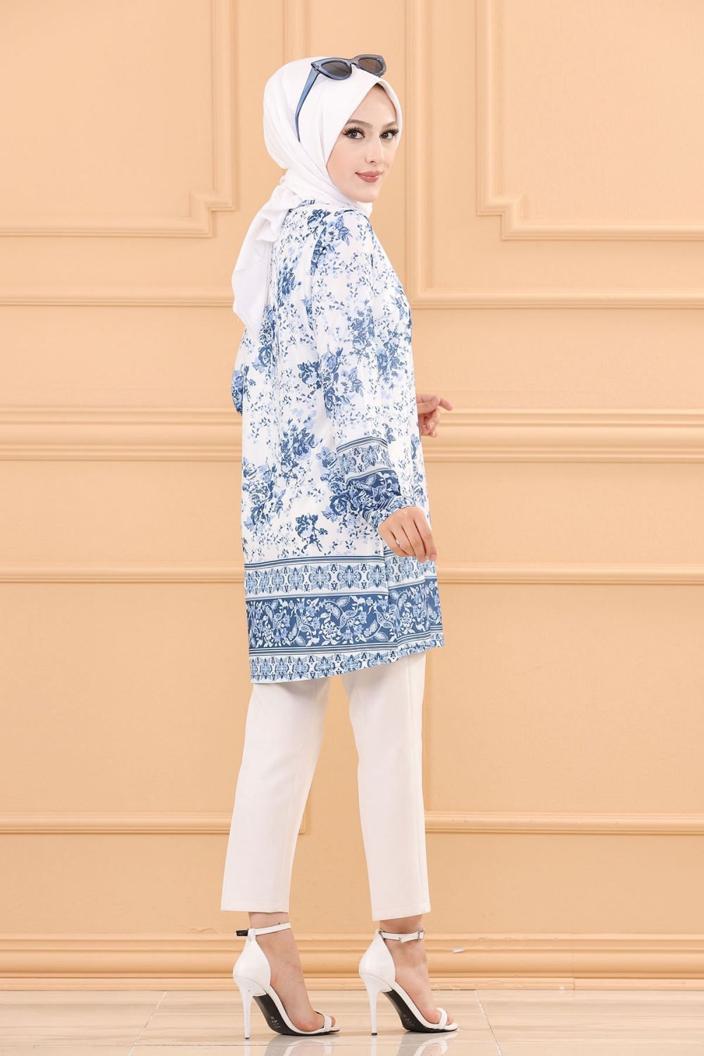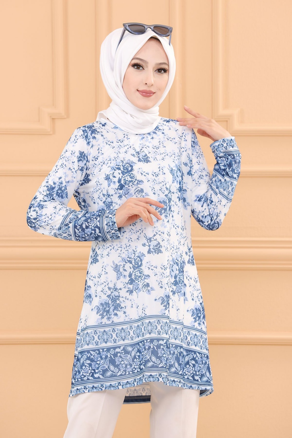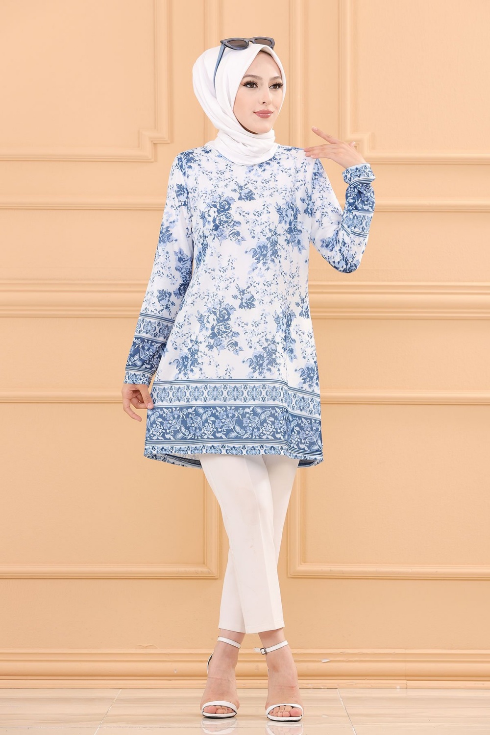Tunique a motifs fleurs et arabesques pour femmes (Tenues Hijab Chic) - Couleur bleu