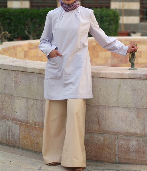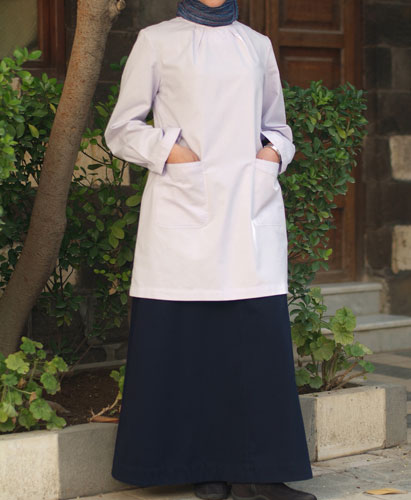 Description: hits just short of knee; 2 front patch pockets round neck with loop and button back opening; 4 pleats from neckline; no cuffs. Imported.