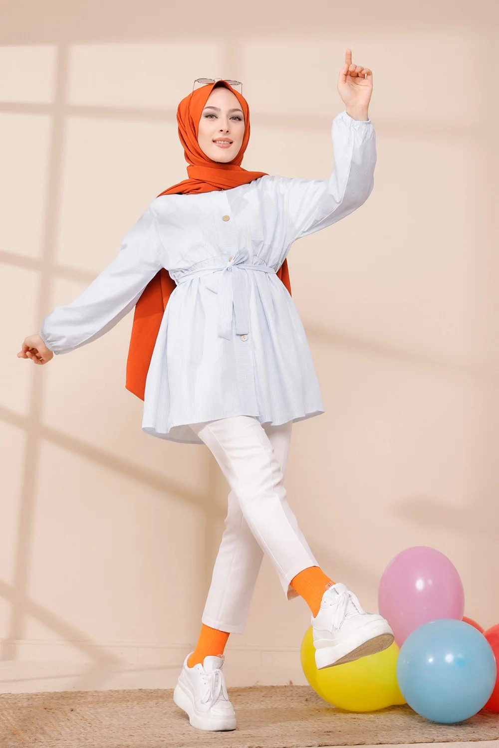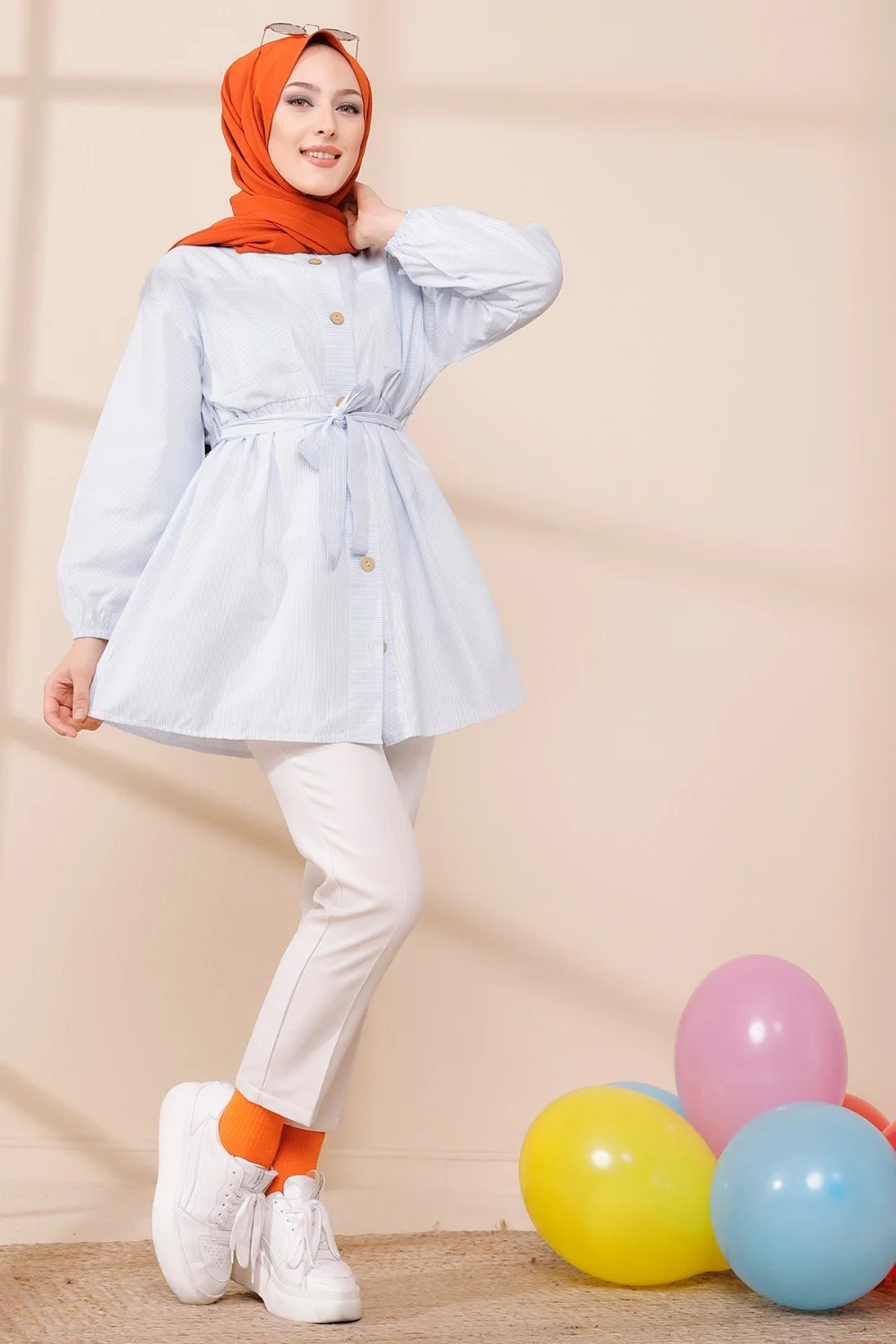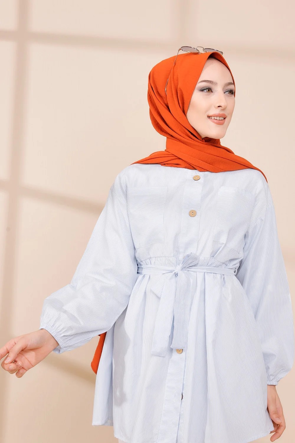 Tunique a rayures avec ceinture pour femme (Boutique Hijab en ligne - France) - Couleur bleu ciel