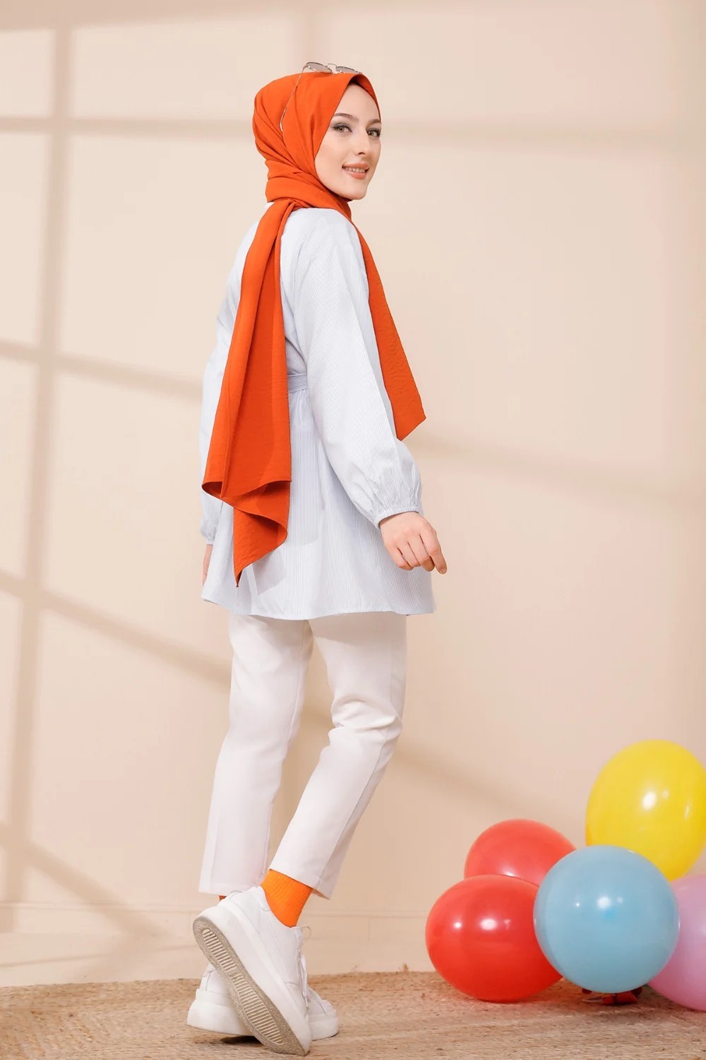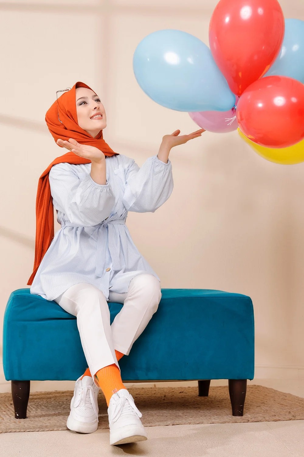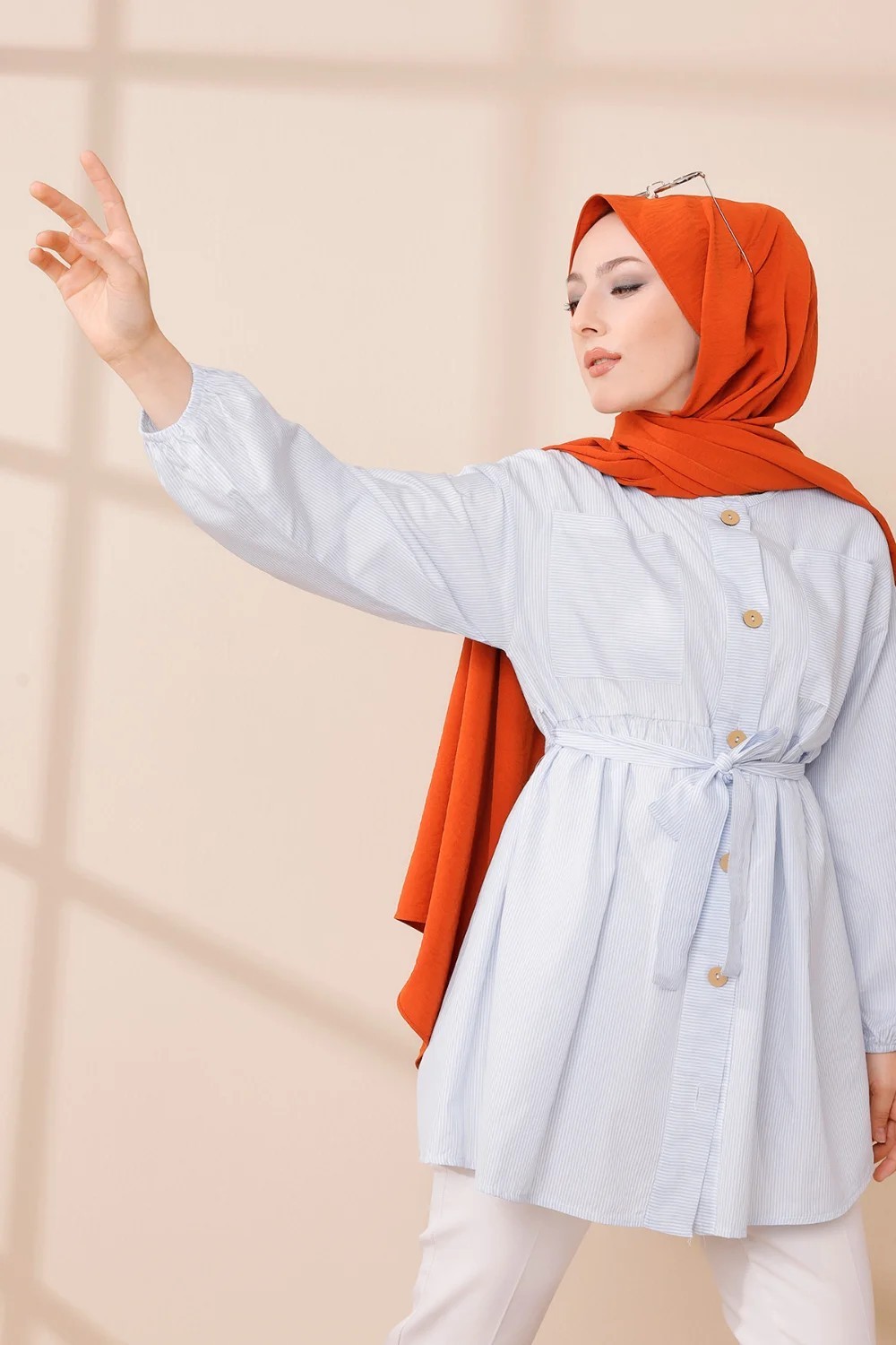 Tunique à rayures avec ceinture pour femme (Boutique Hijab en ligne - France) - Couleur bleu ciel Vetement & Accessoire