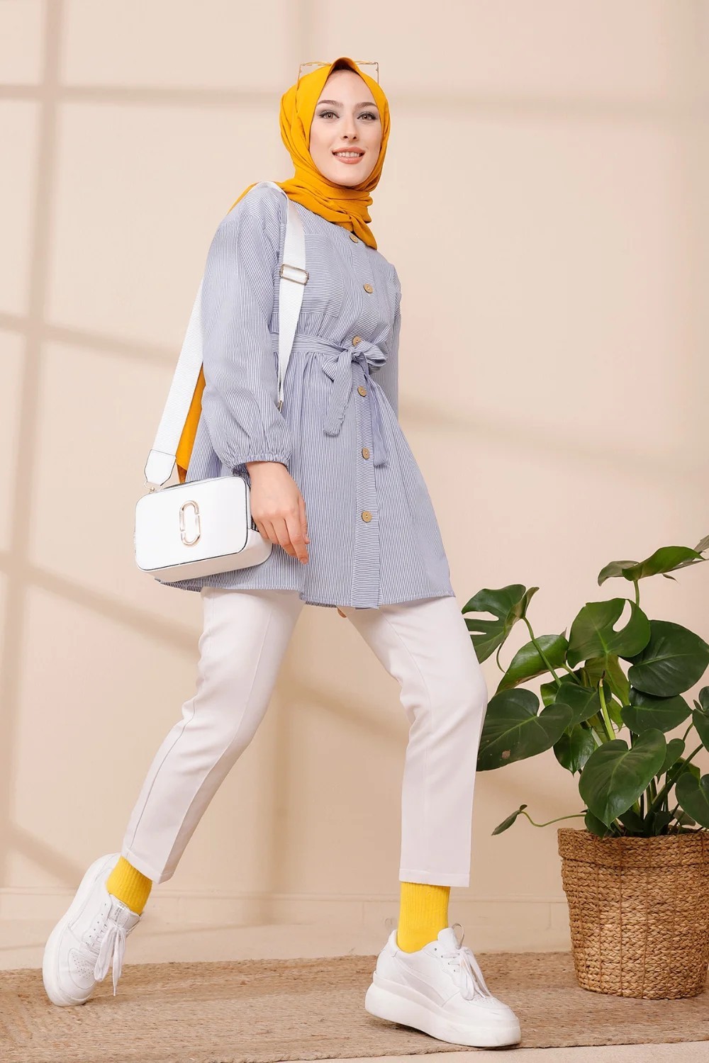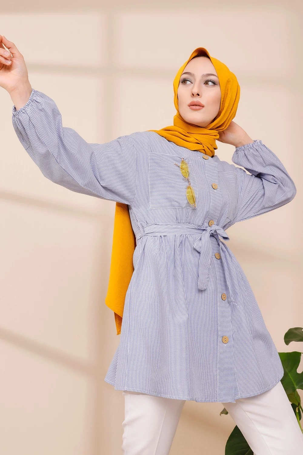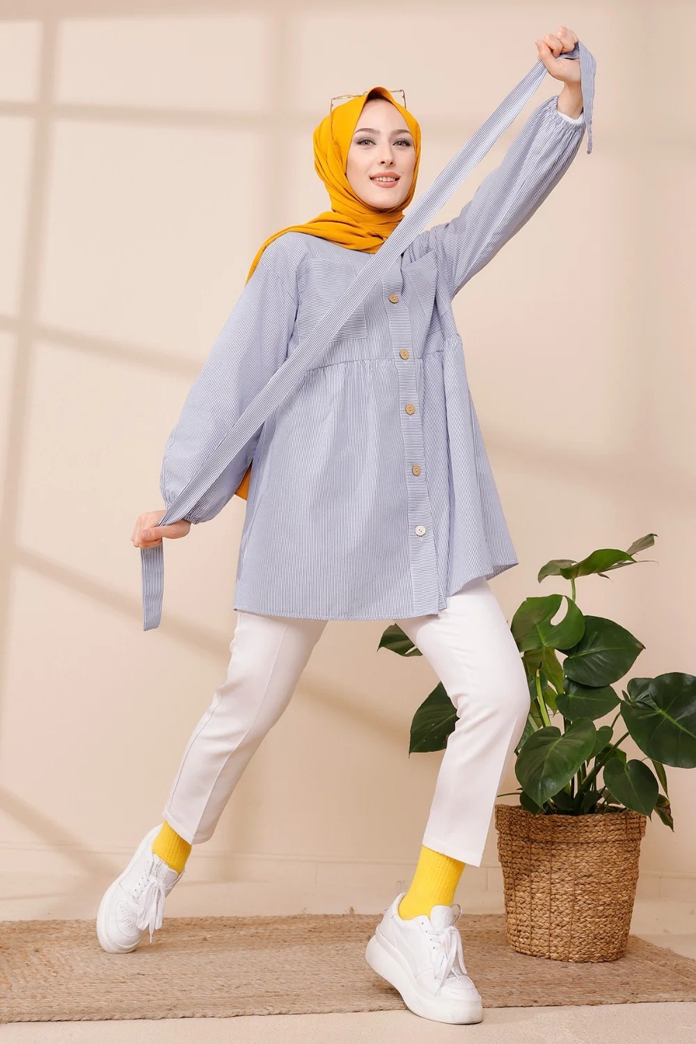 Tunique a rayures avec ceinture pour femme (Modest Fashion & Hijab) - Couleur bleu clair