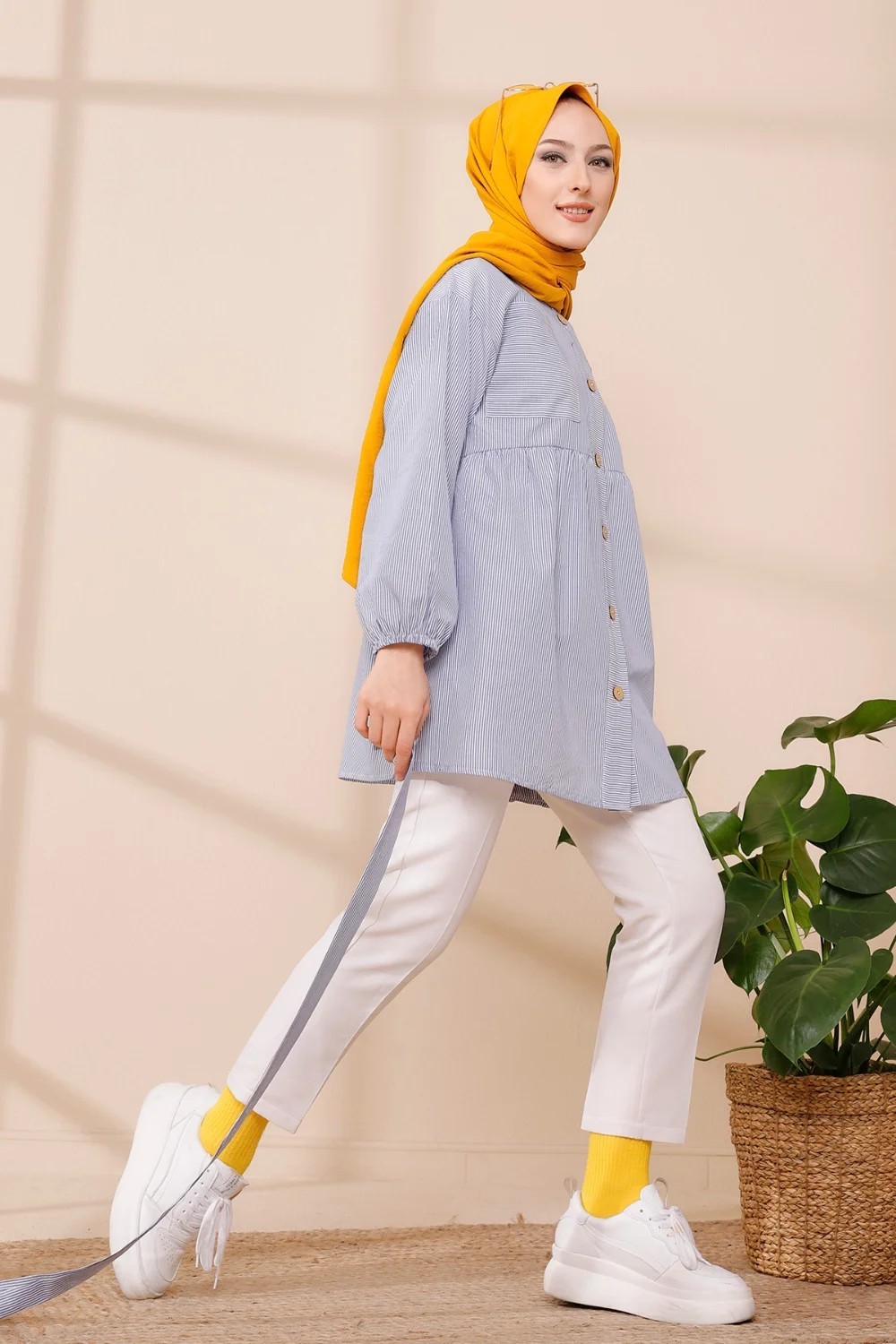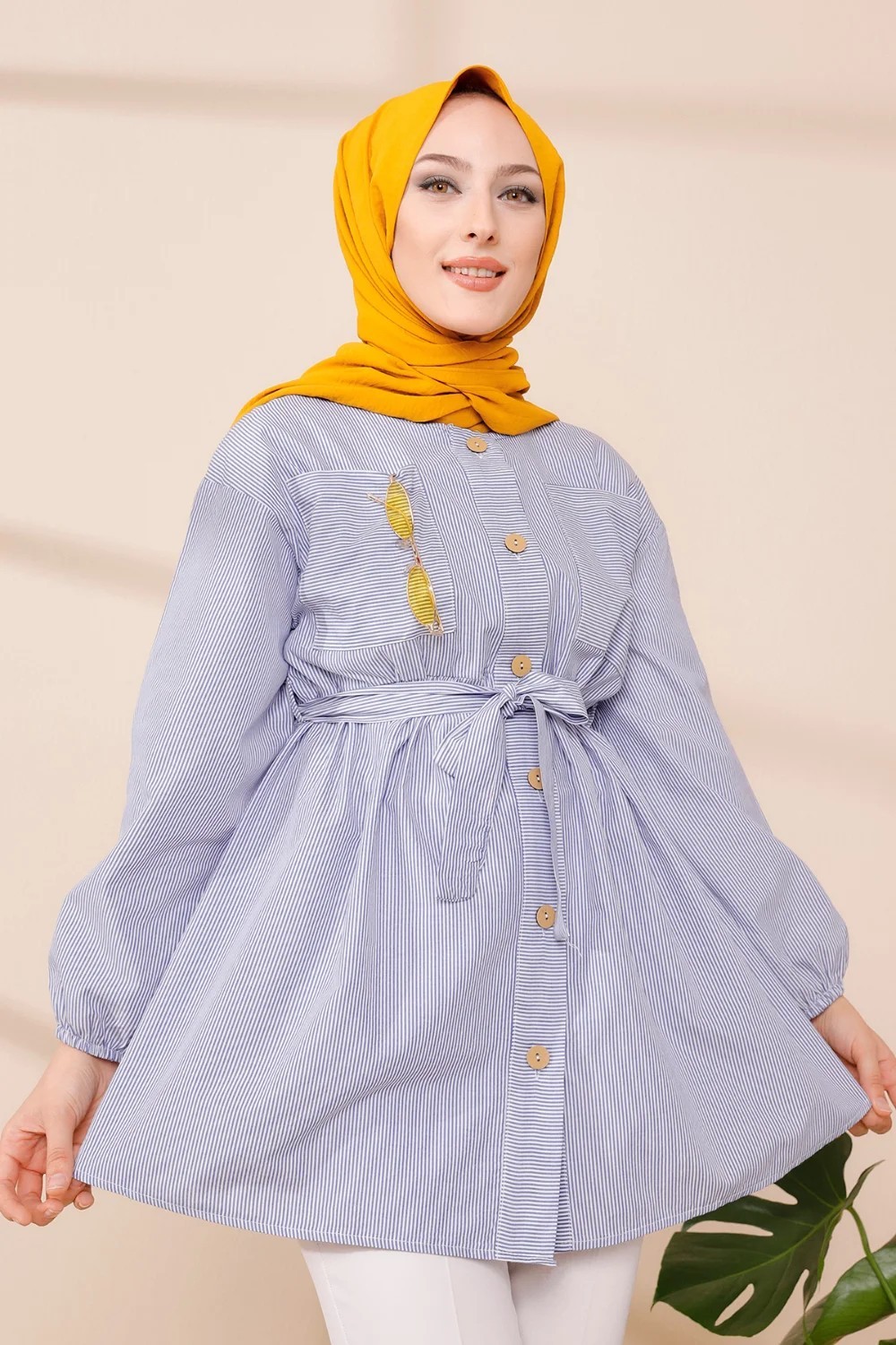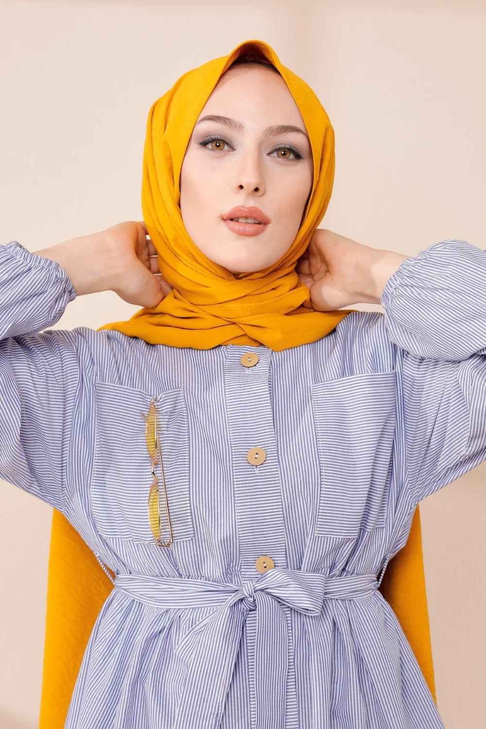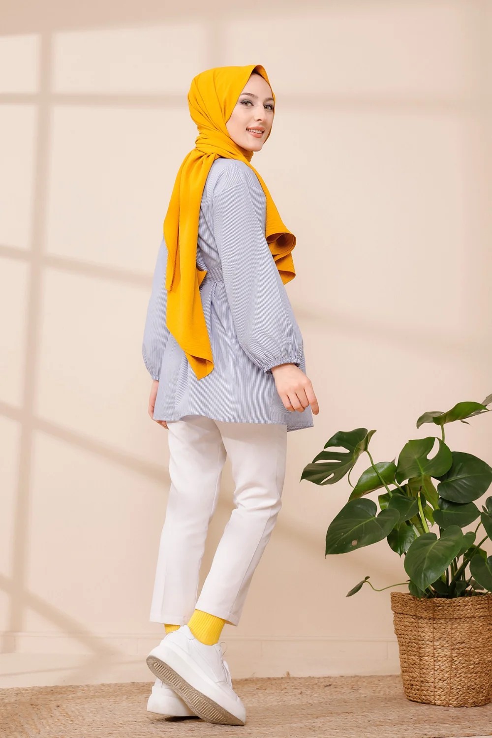 Tunique a rayures avec ceinture pour femme (Modest Fashion & Hijab) - Couleur bleu clair